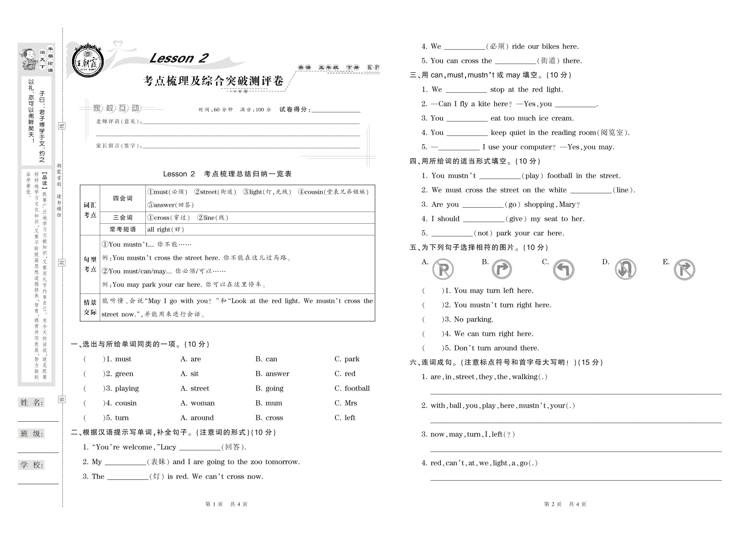 2021下册五年级英语科普版 Lesson 2 考点梳理及综合突破测评卷
