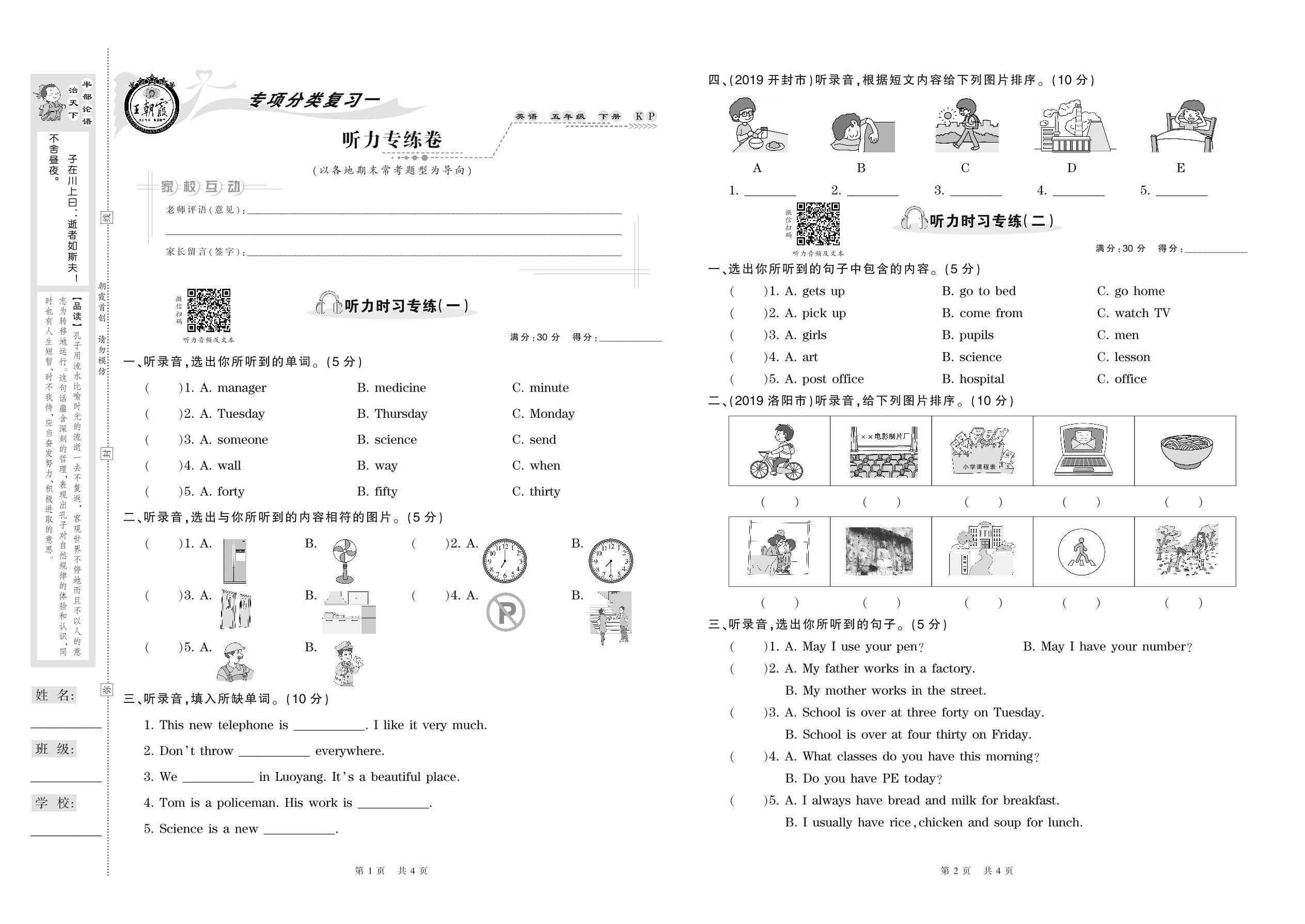 2021下册五年级英语科普版 听力专练卷