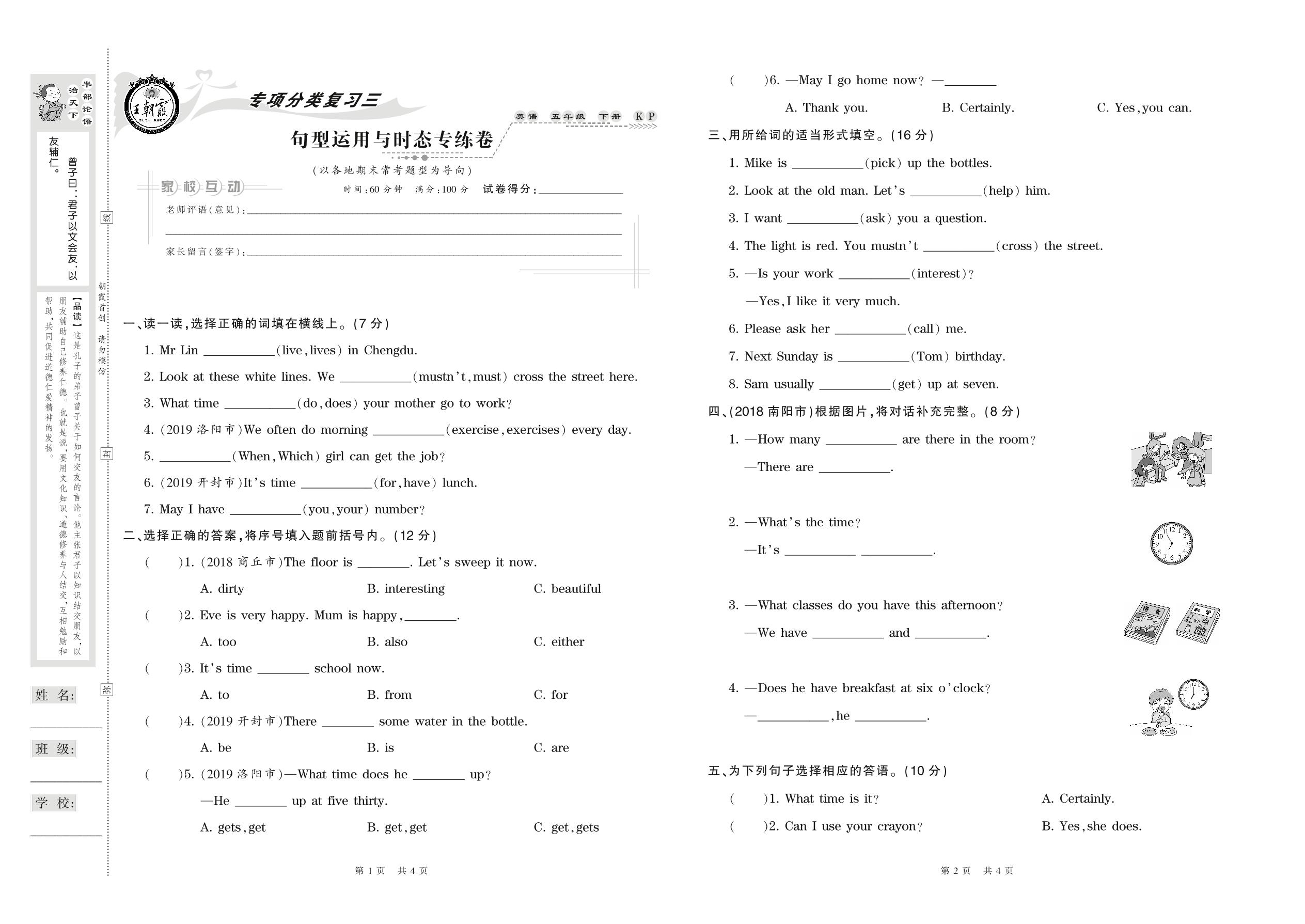 2021下册五年级英语科普版 句型运用与时态专练卷