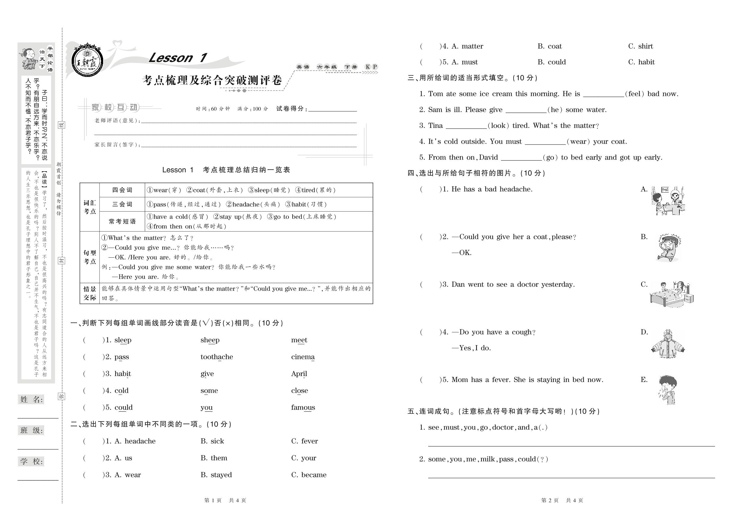 2021下册六年级英语科普版 Lesson 1 考点梳理及综合突破测评卷