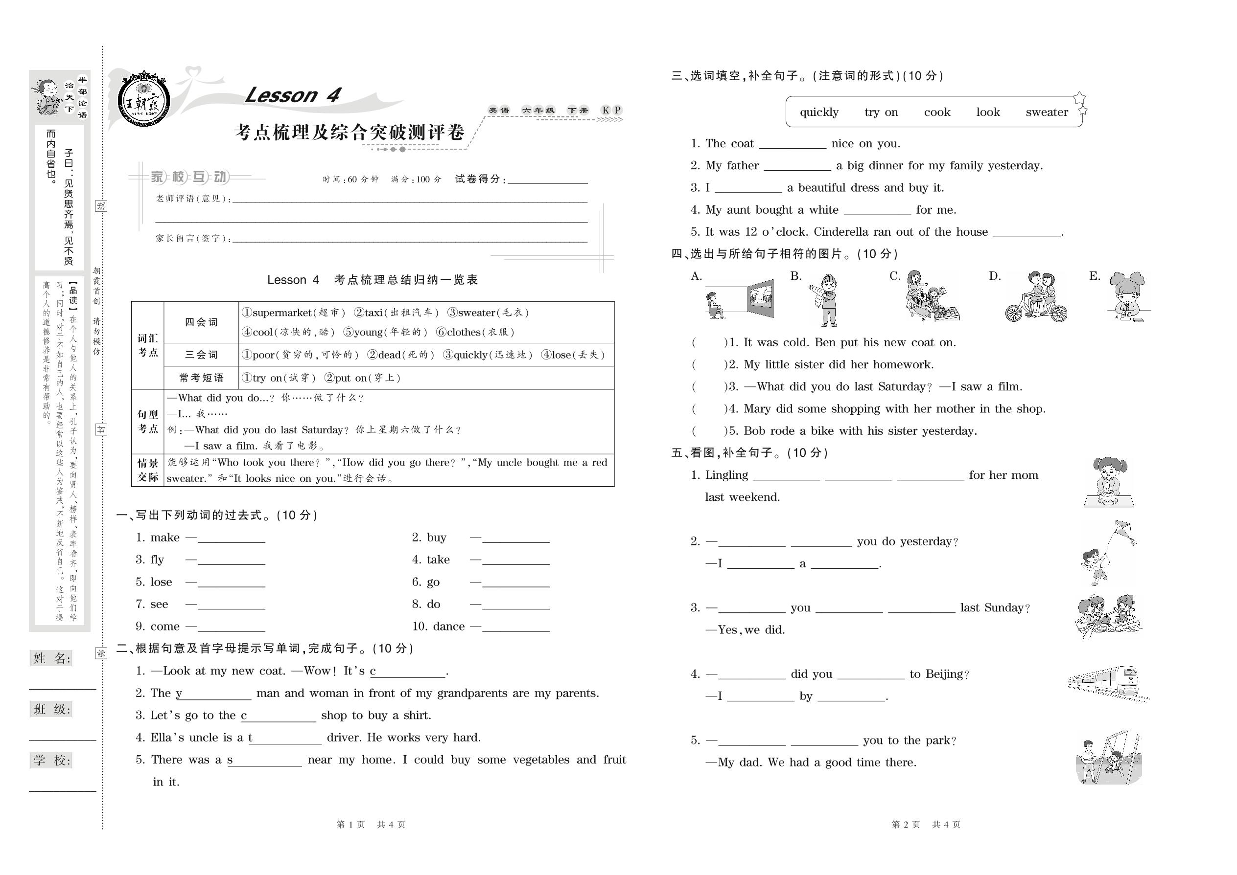 2021下册六年级英语科普版 Lesson 4 考点梳理及综合突破测评卷
