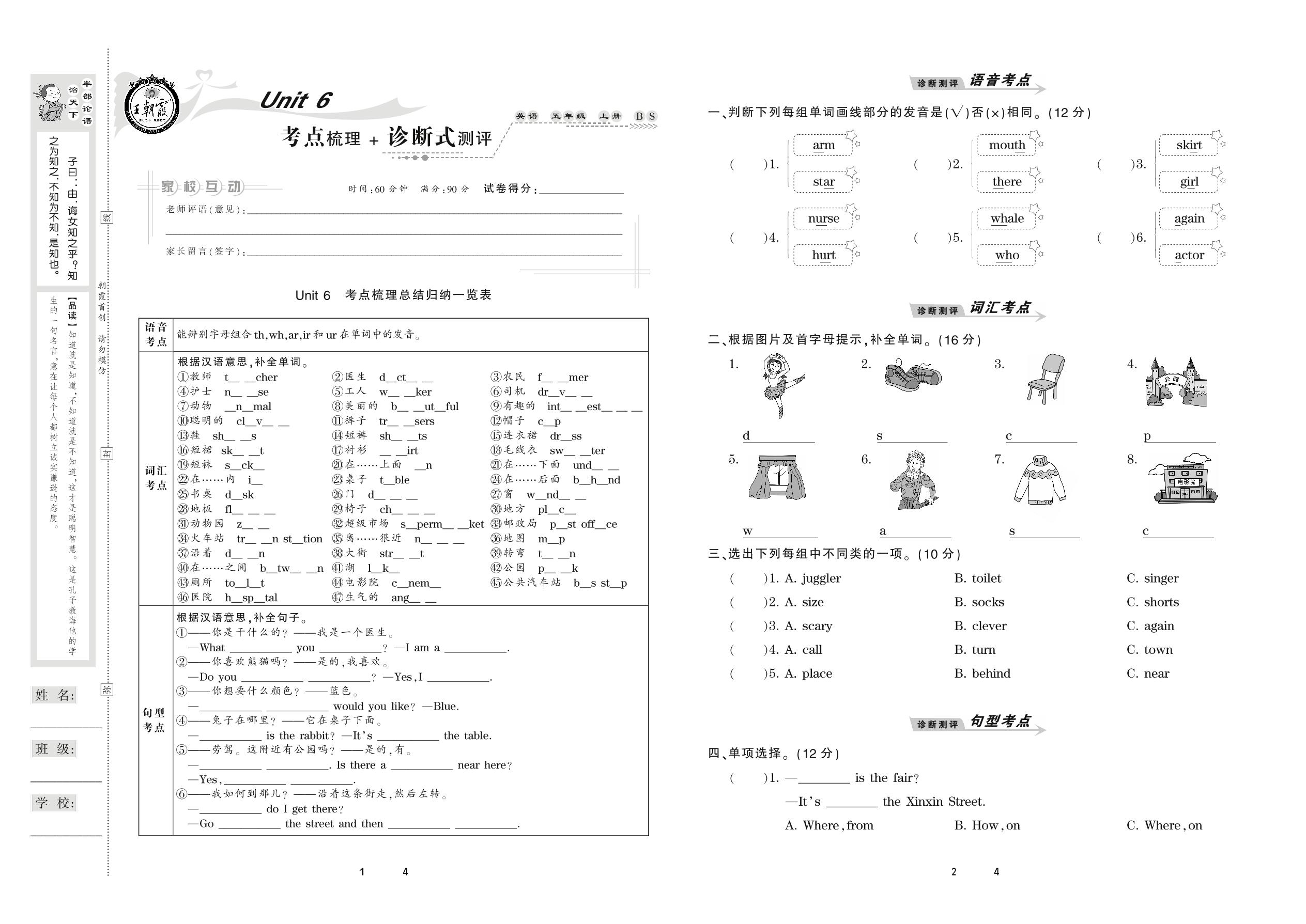2020上册五年级英语北师版 Unit 6 考点梳理+诊断式测评