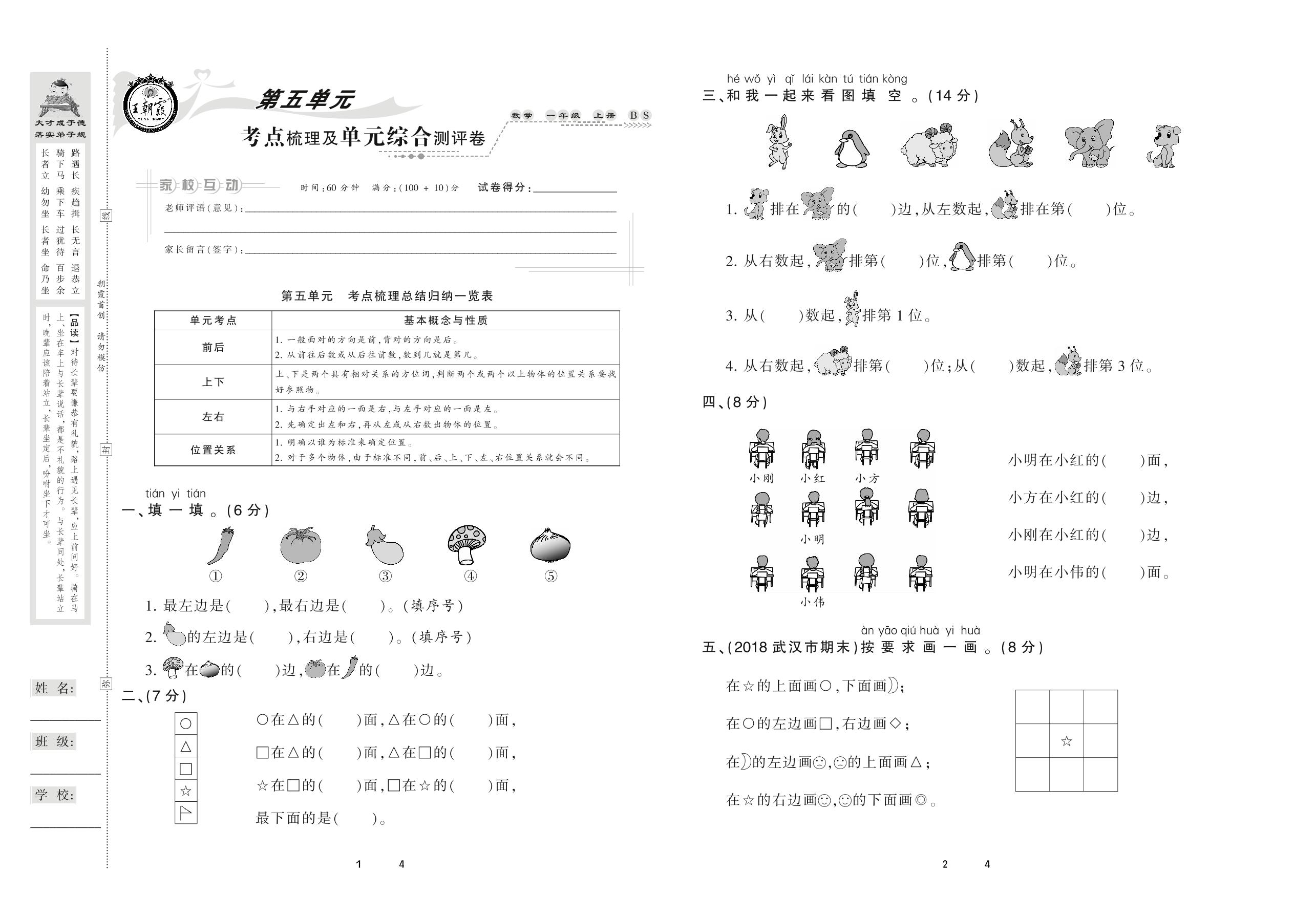2020上册一年级数学北师版 第五单元 考点梳理及单元综合测评卷