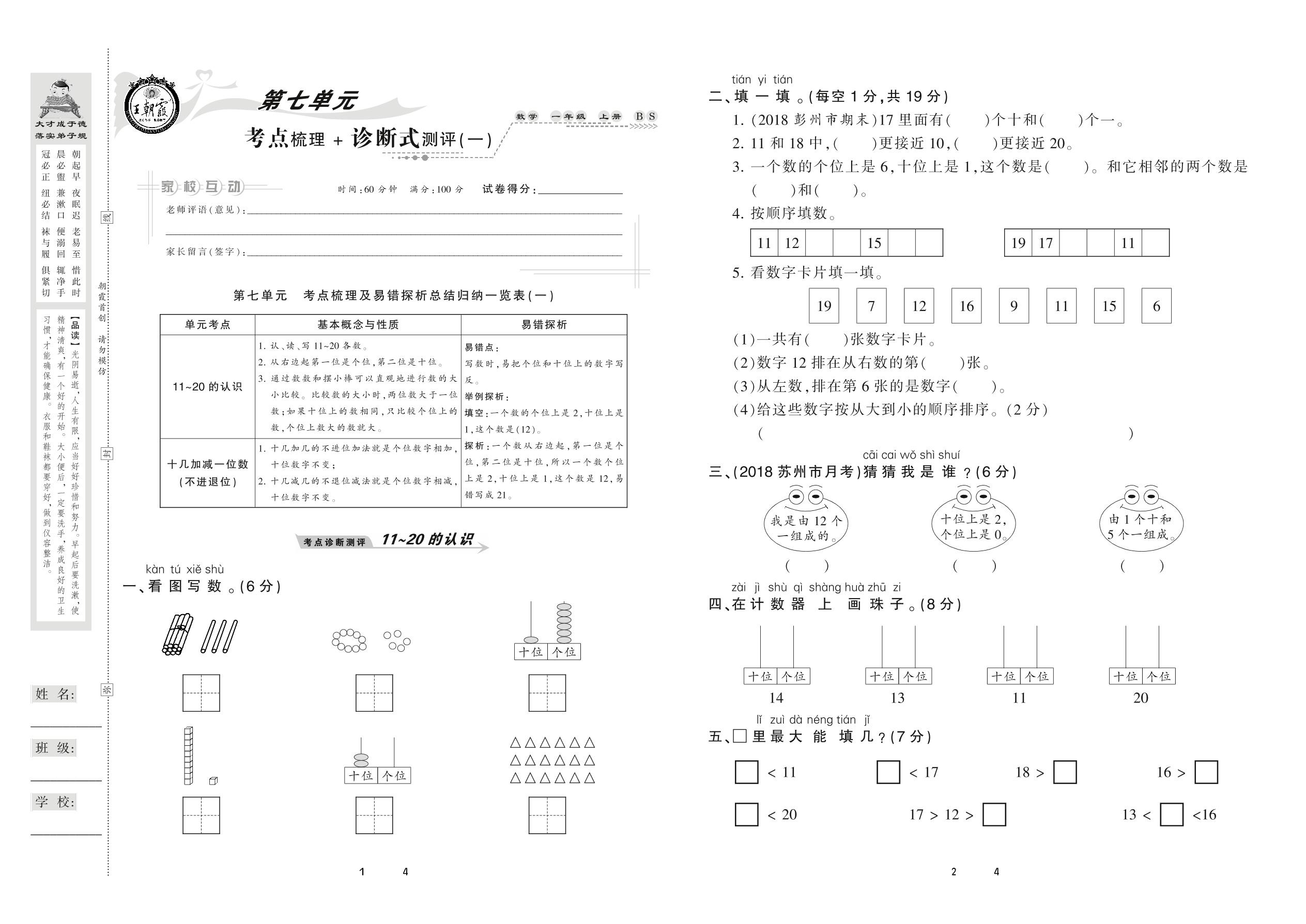 2020上册一年级数学北师版 第七单元 考点梳理+诊断式测评(一)