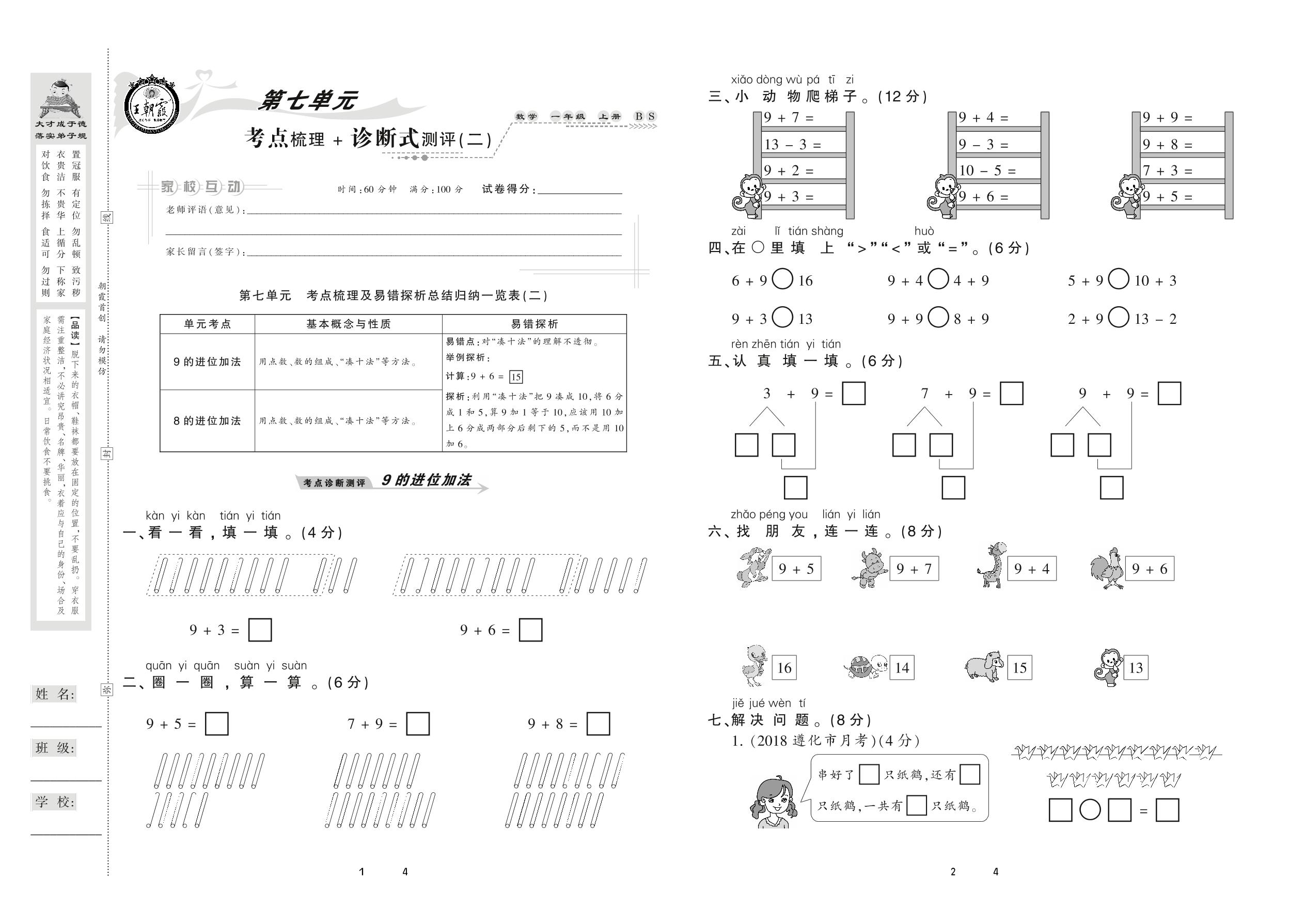 2020上册一年级数学北师版 第七单元 考点梳理+诊断式测评(二)