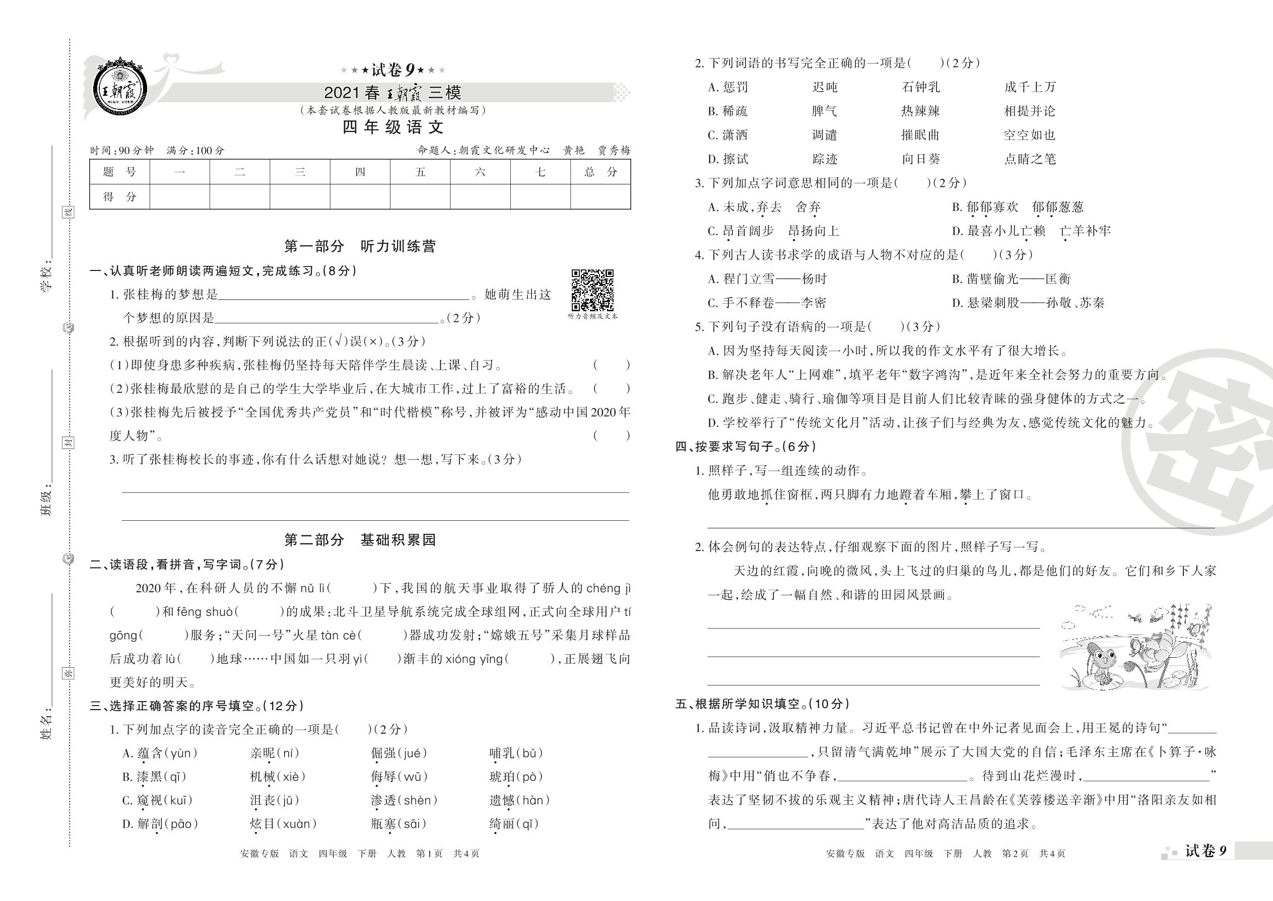 王朝霞期末模拟卷四年级下册语文(人教版)_R210801182439【9】
