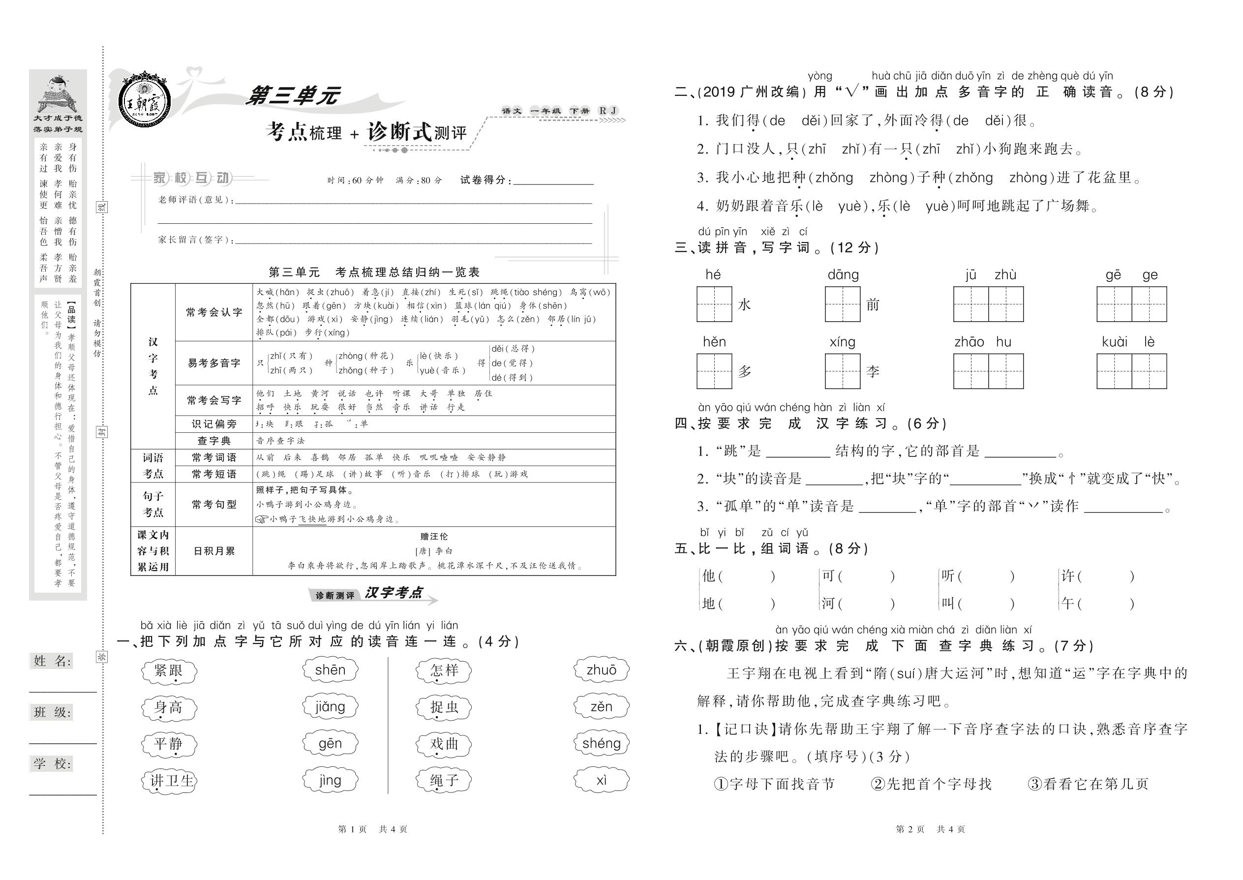 2021下册一年级语文人教版 第三单元 考点梳理+诊断式测评