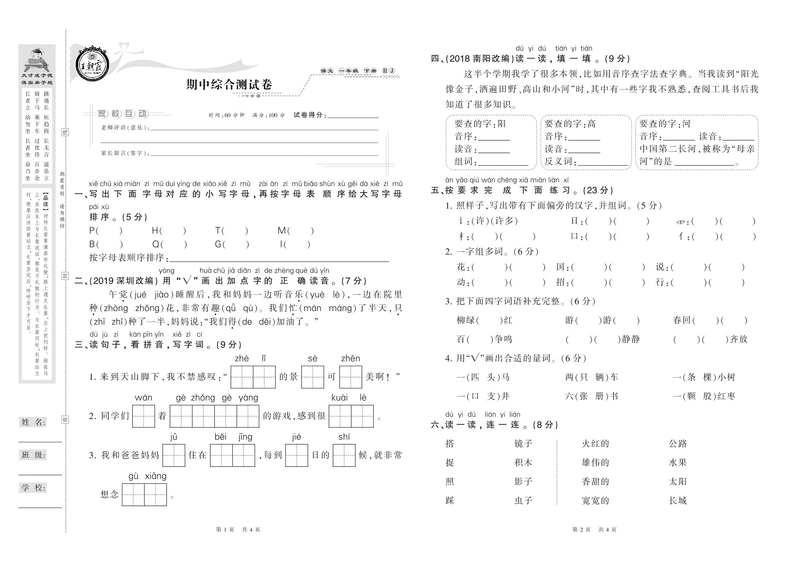 一年级语文人教版下册期中卷