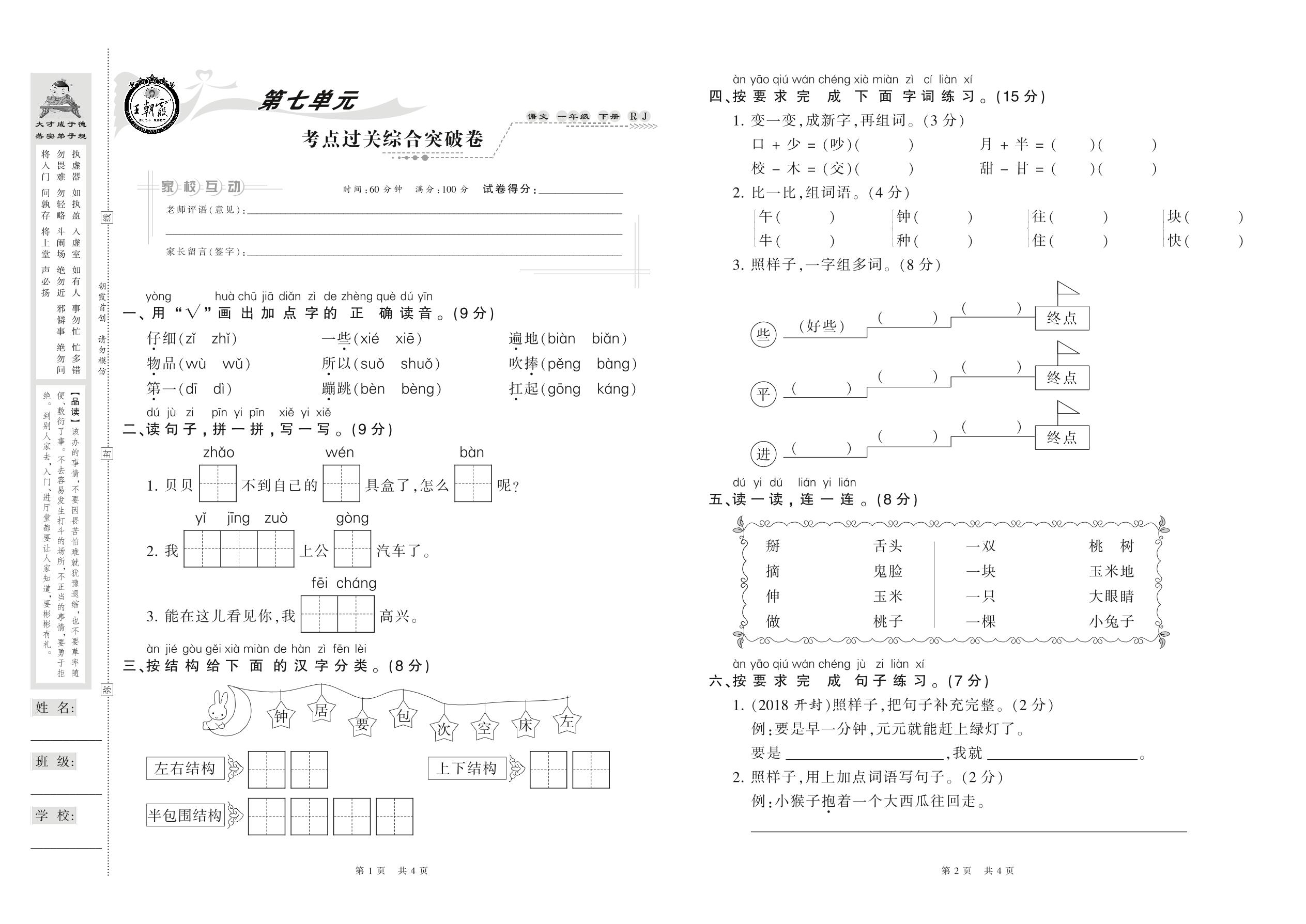 2021下册一年级语文人教版 第七单元 考点过关综合突破卷
