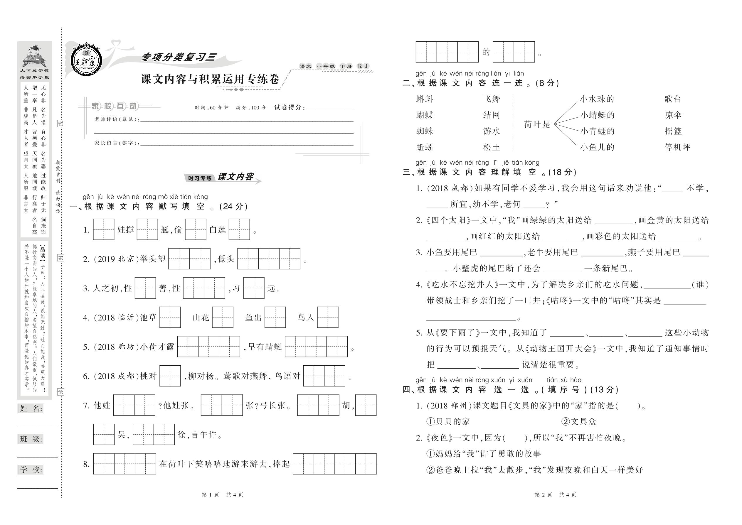 2021下册一年级语文人教版 课文内容与积累运用专练卷
