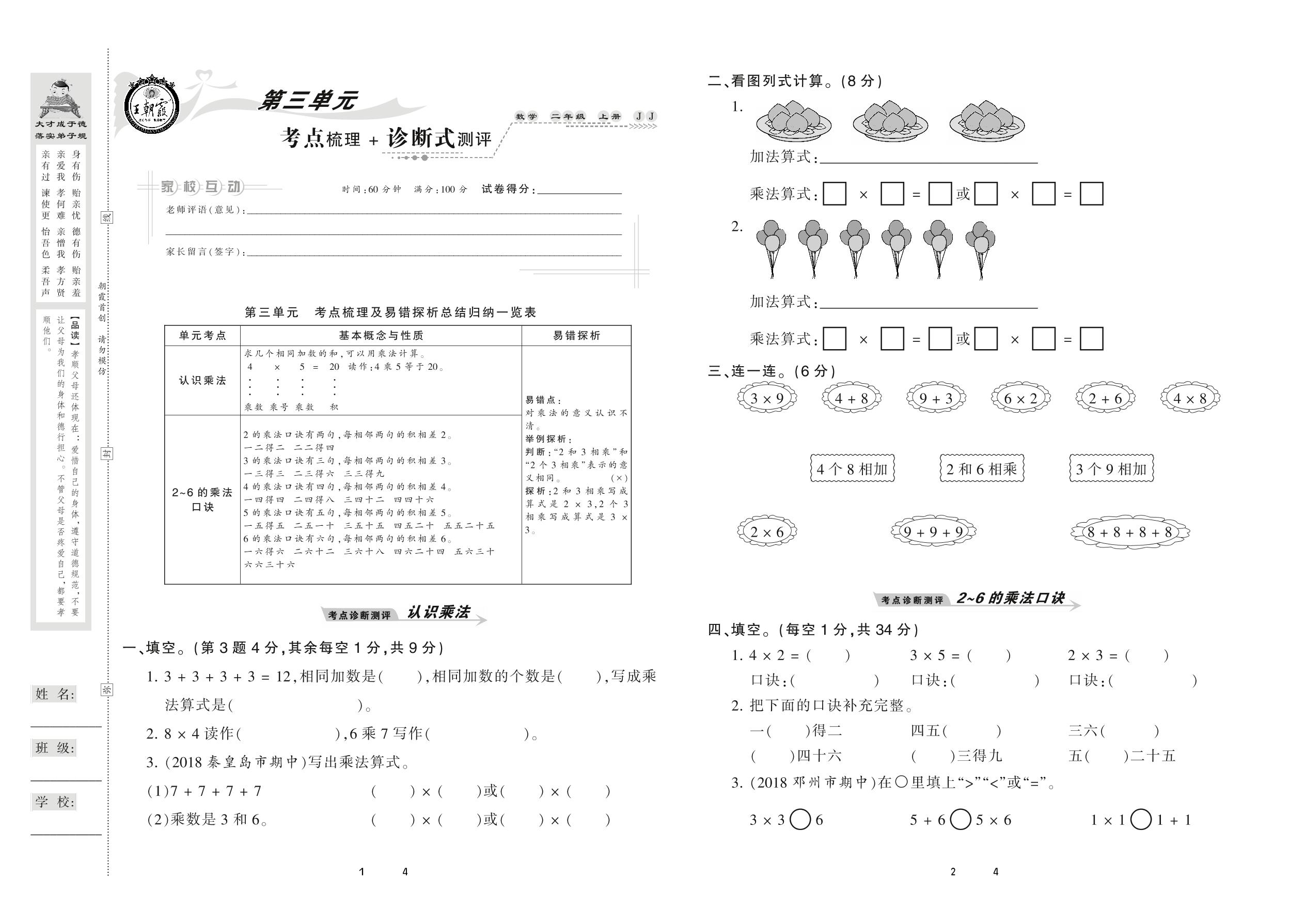 2020上册二年级数学冀教版 第三单元 考点梳理+诊断式测评