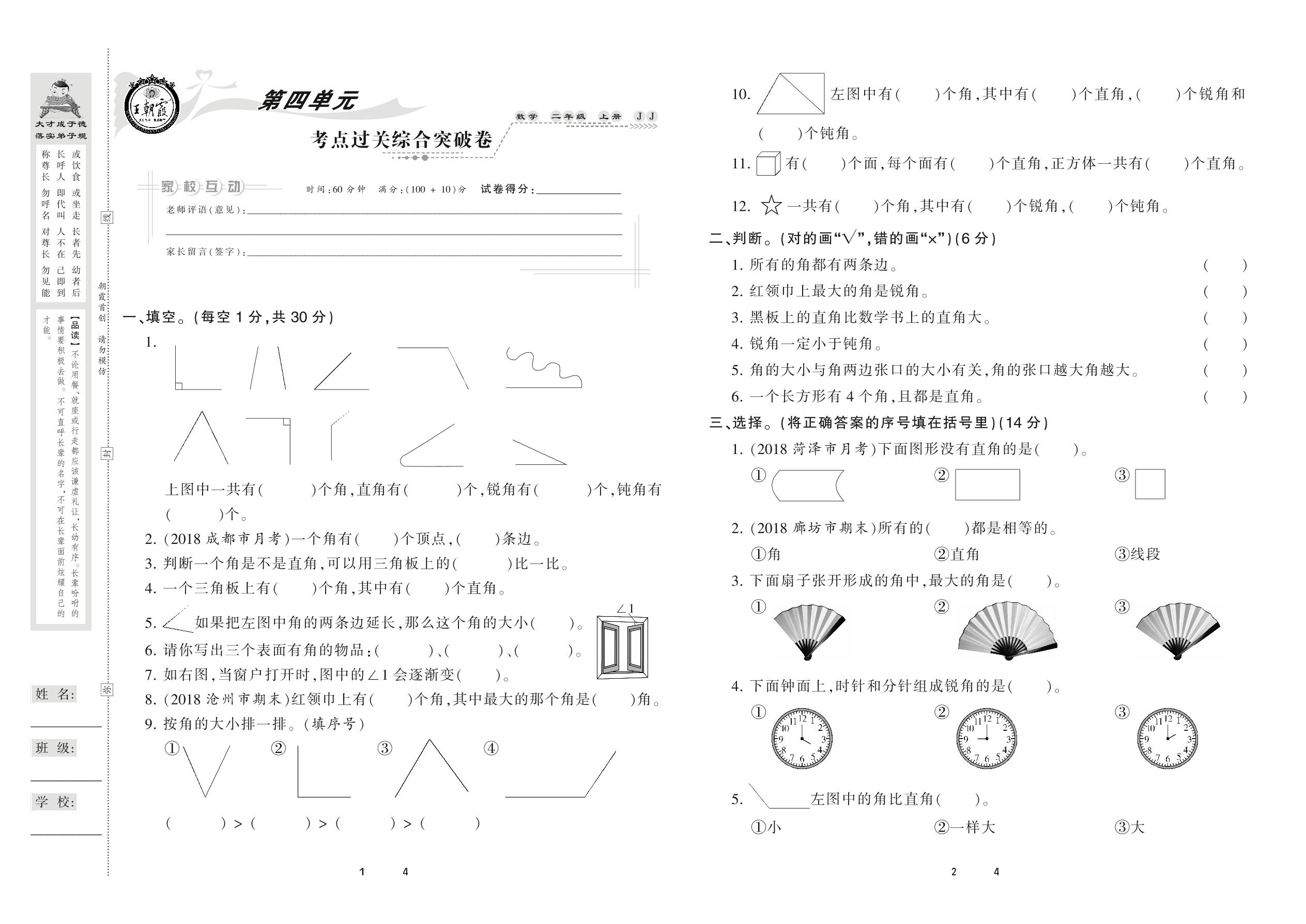 2020上册二年级数学冀教版 第四单元 考点过关综合突破卷
