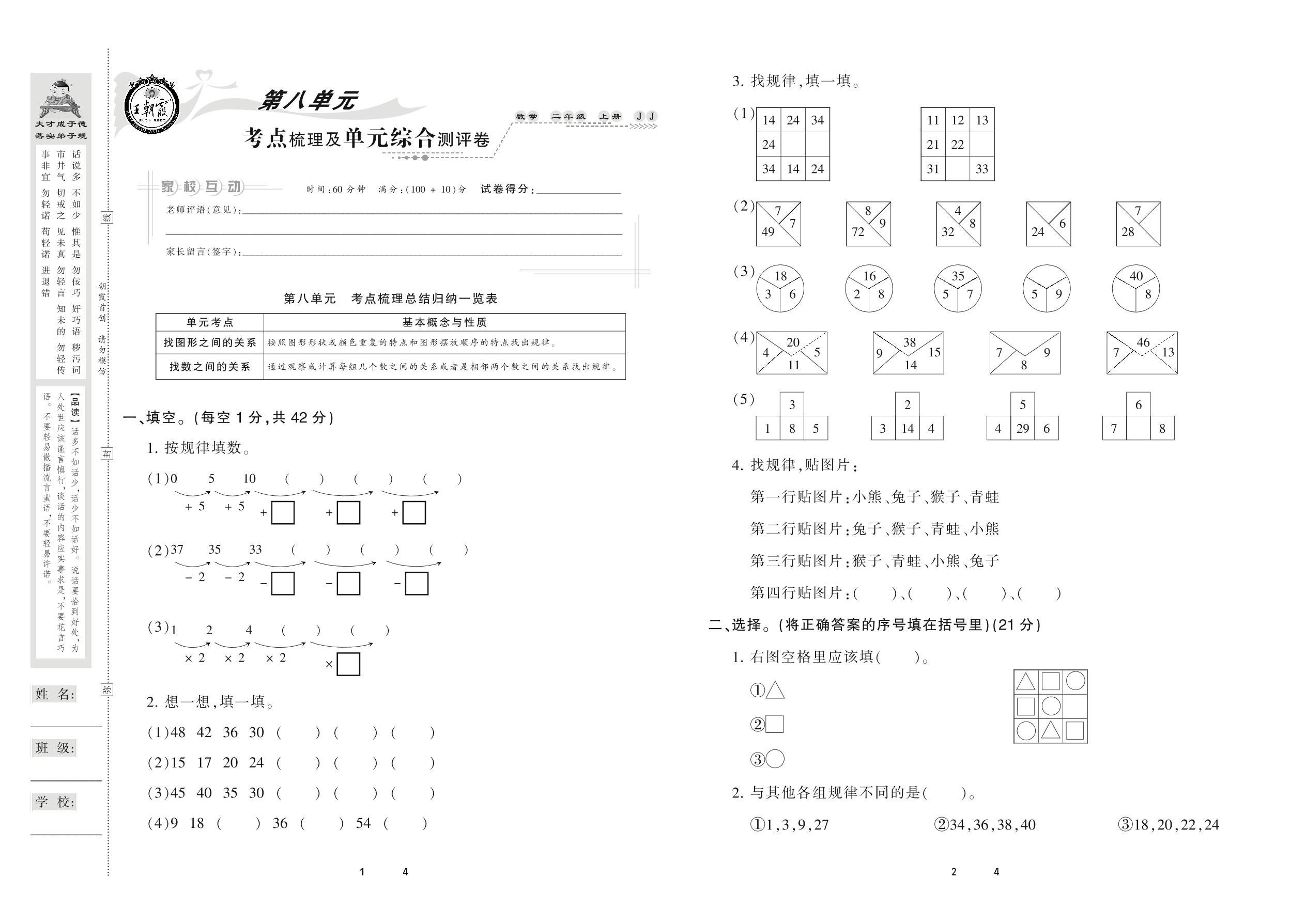 2020上册二年级数学冀教版 第八单元 考点梳理及单元综合测评卷