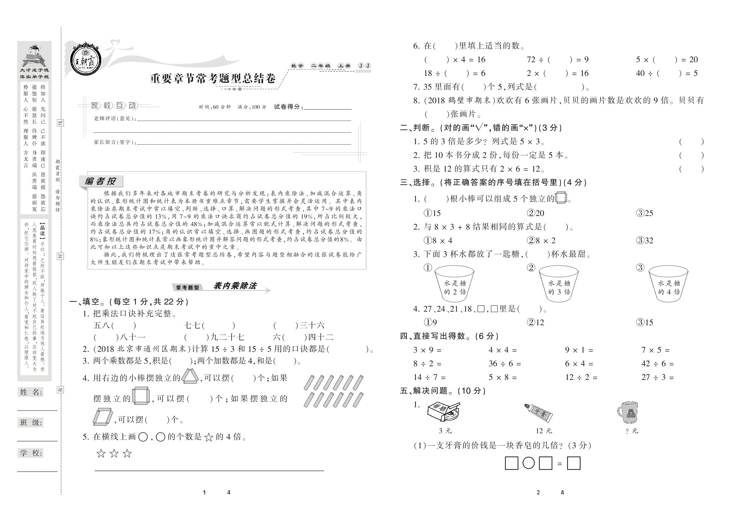 2020上册二年级数学冀教版 重要章节常考题型总结卷