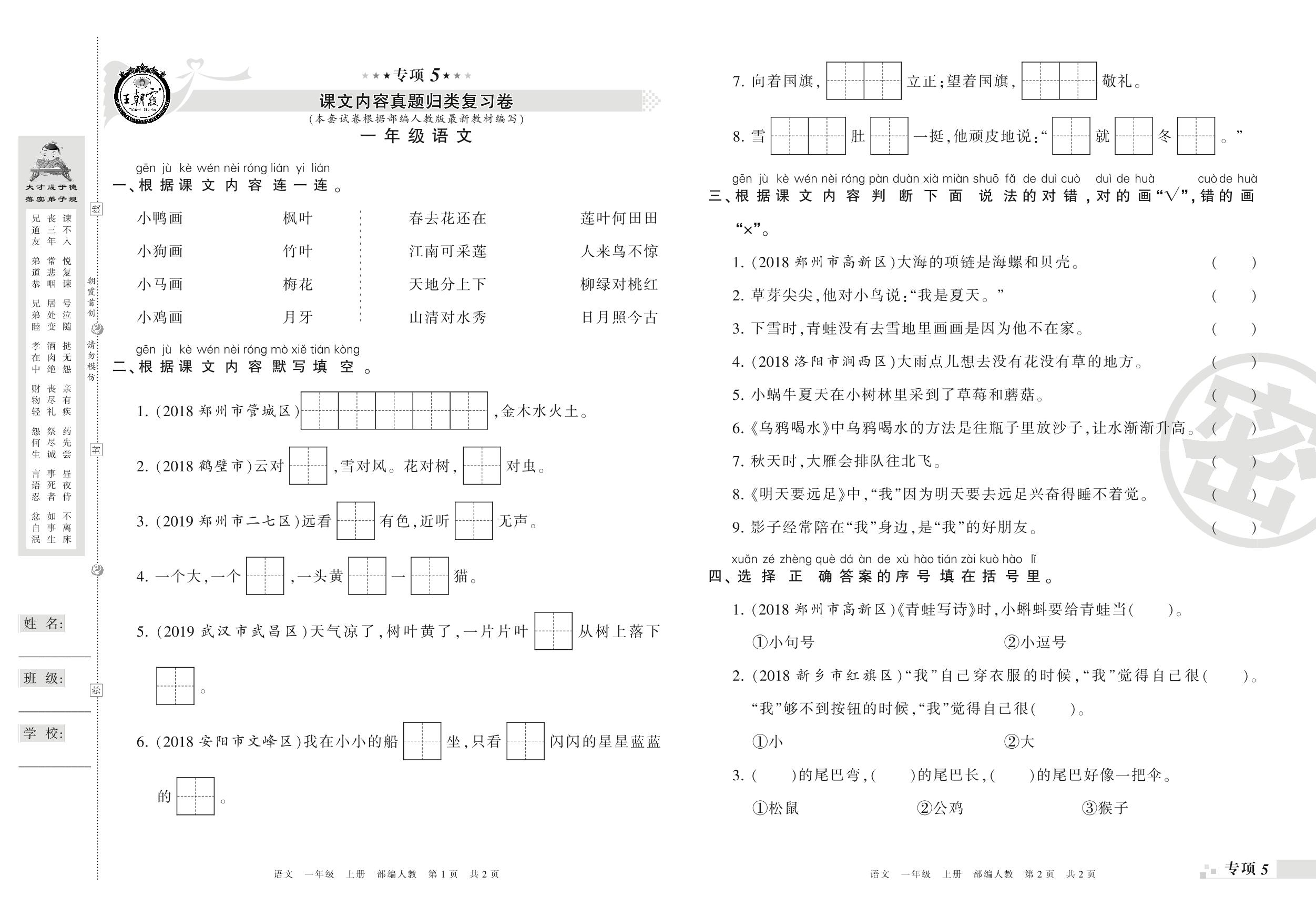 王朝霞期末专项卷——课文内容、积累运用真题归类复习卷一年级上册语文(人教版)_R210731180814【0】