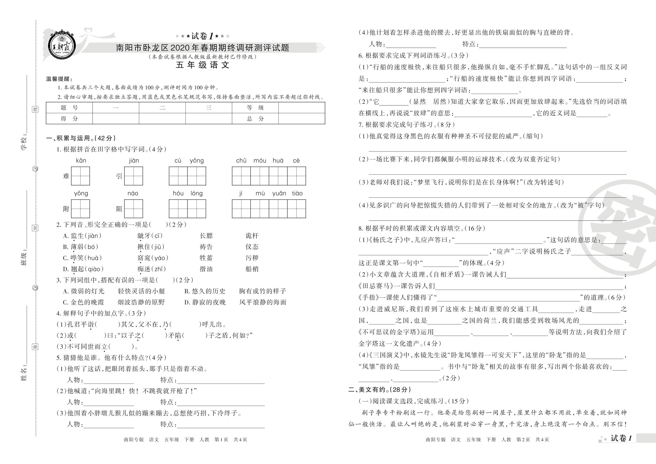 2019-2020学年第二学期南阳市卧龙区五年级语文试卷(人教版)【1】