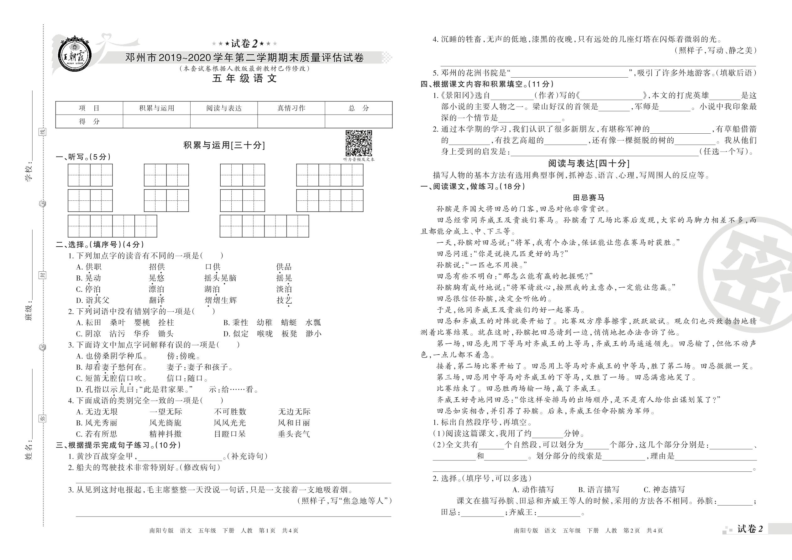 2019-2020学年第二学期邓州市五年级语文试卷(人教版)【2】