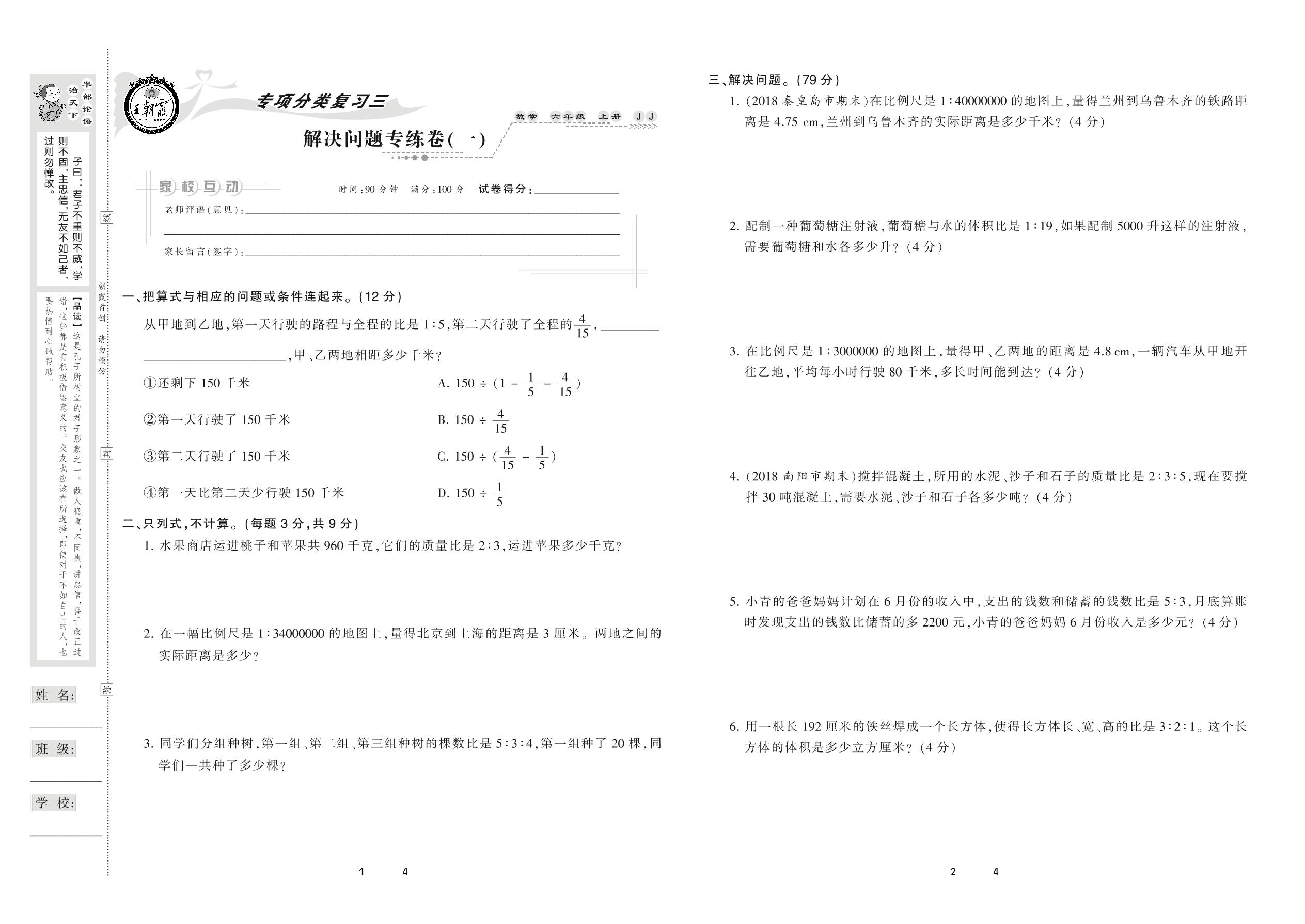 2020上册六年级数学冀教版 解决问题专练卷(一)