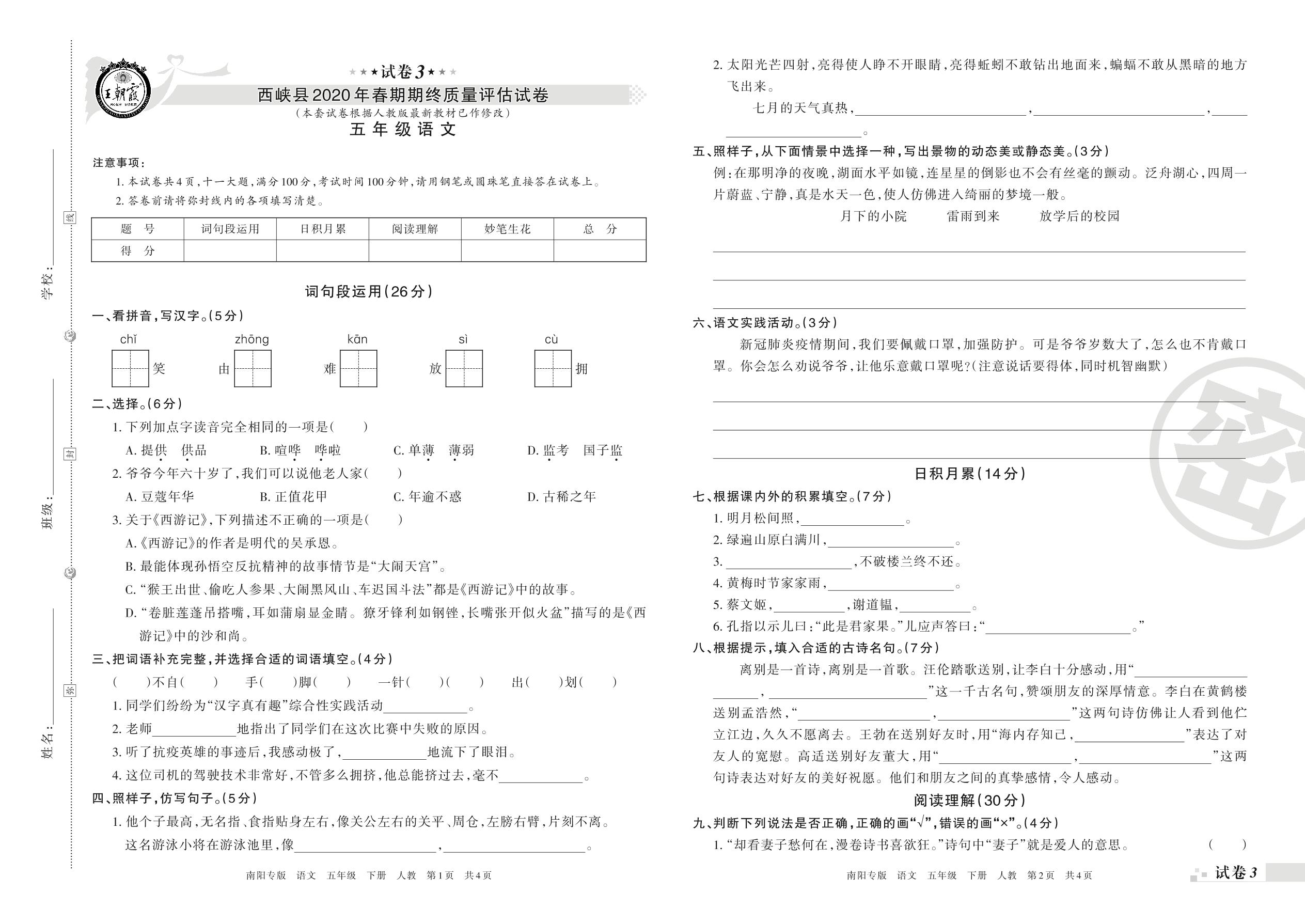 2019-2020学年第二学期南阳市西峡县五年级语文试卷(人教版)【3】