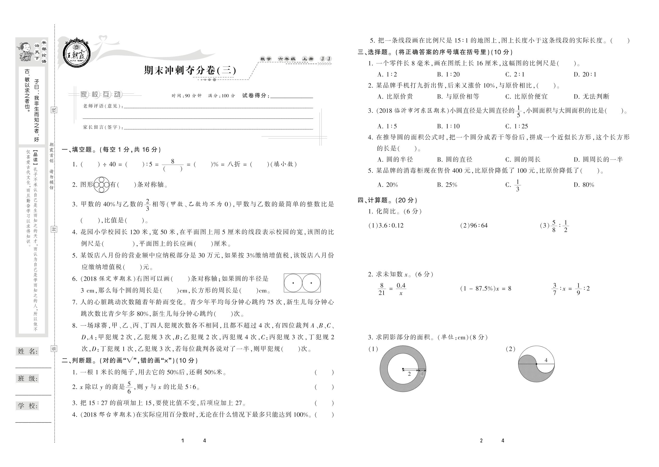 2020上册六年级数学冀教版 期末冲刺夺分卷(三)