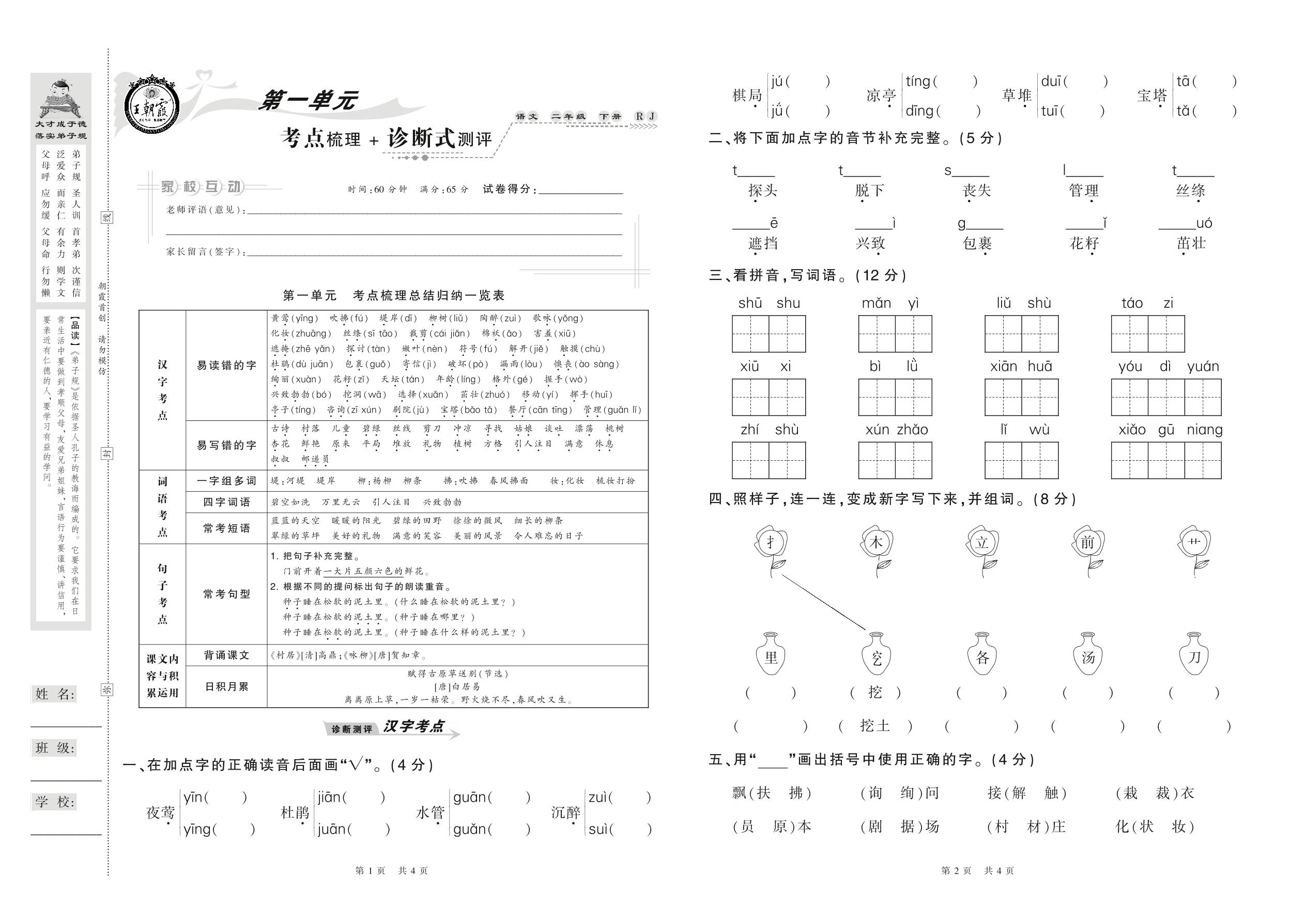 2021下册二年级语文人教版 第一单元 考点梳理+诊断式测评