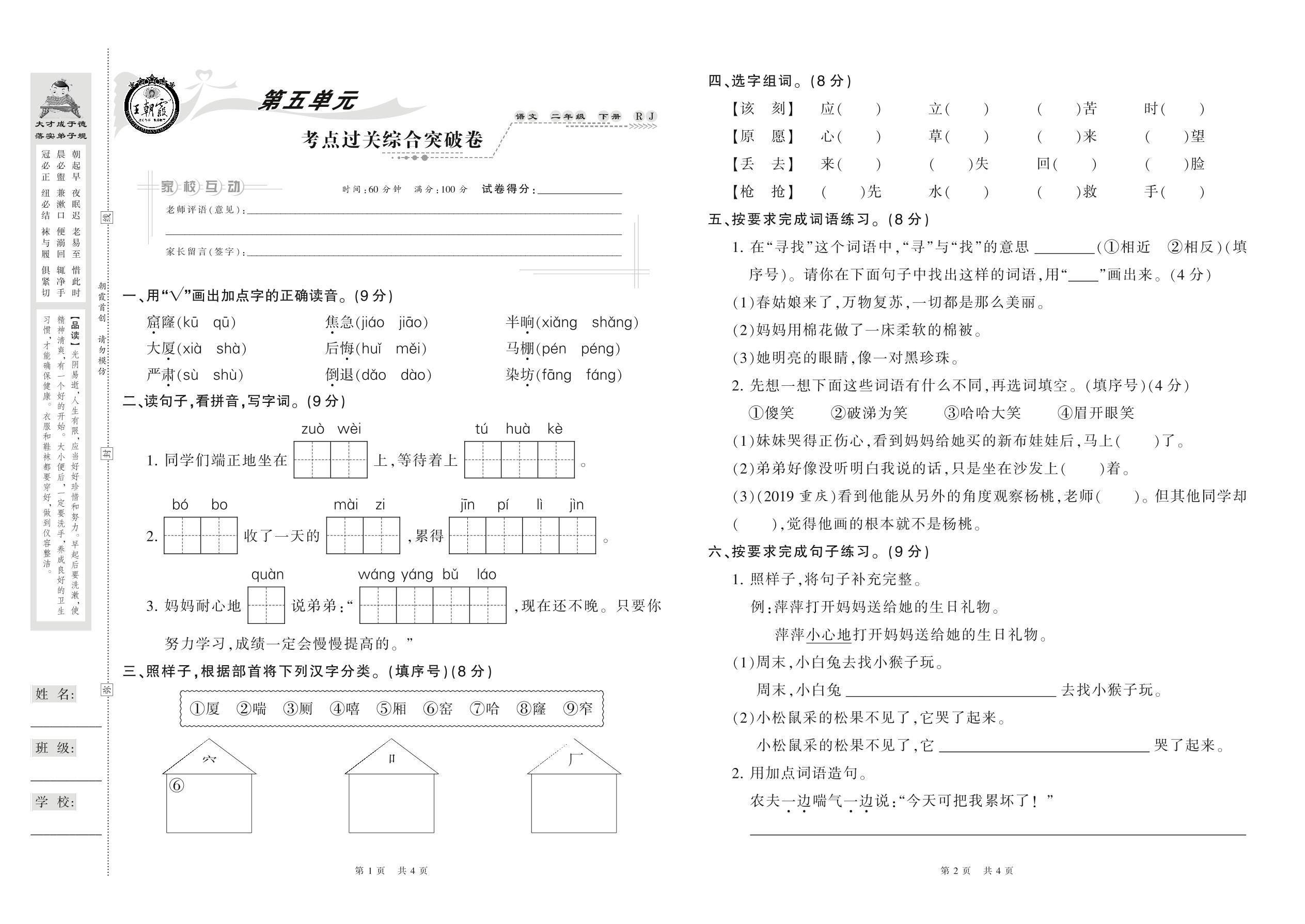 2021下册二年级语文人教版 第五单元 考点过关综合突破卷
