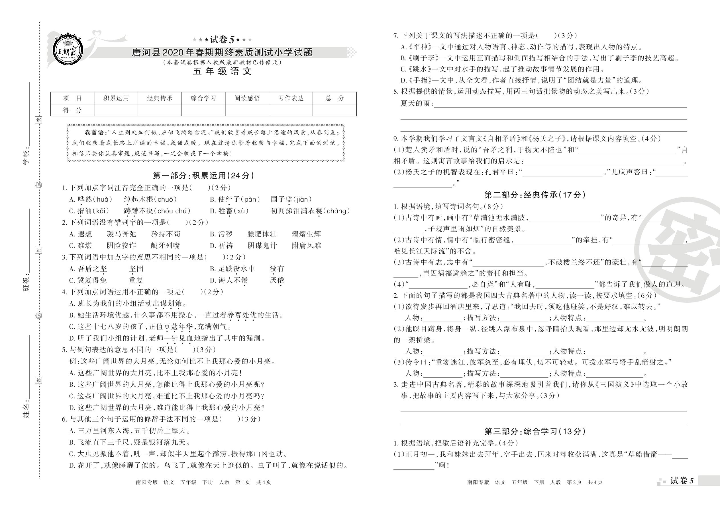 2019-2020学年第二学期南阳市唐河县五年级语文试卷(人教版)【5】