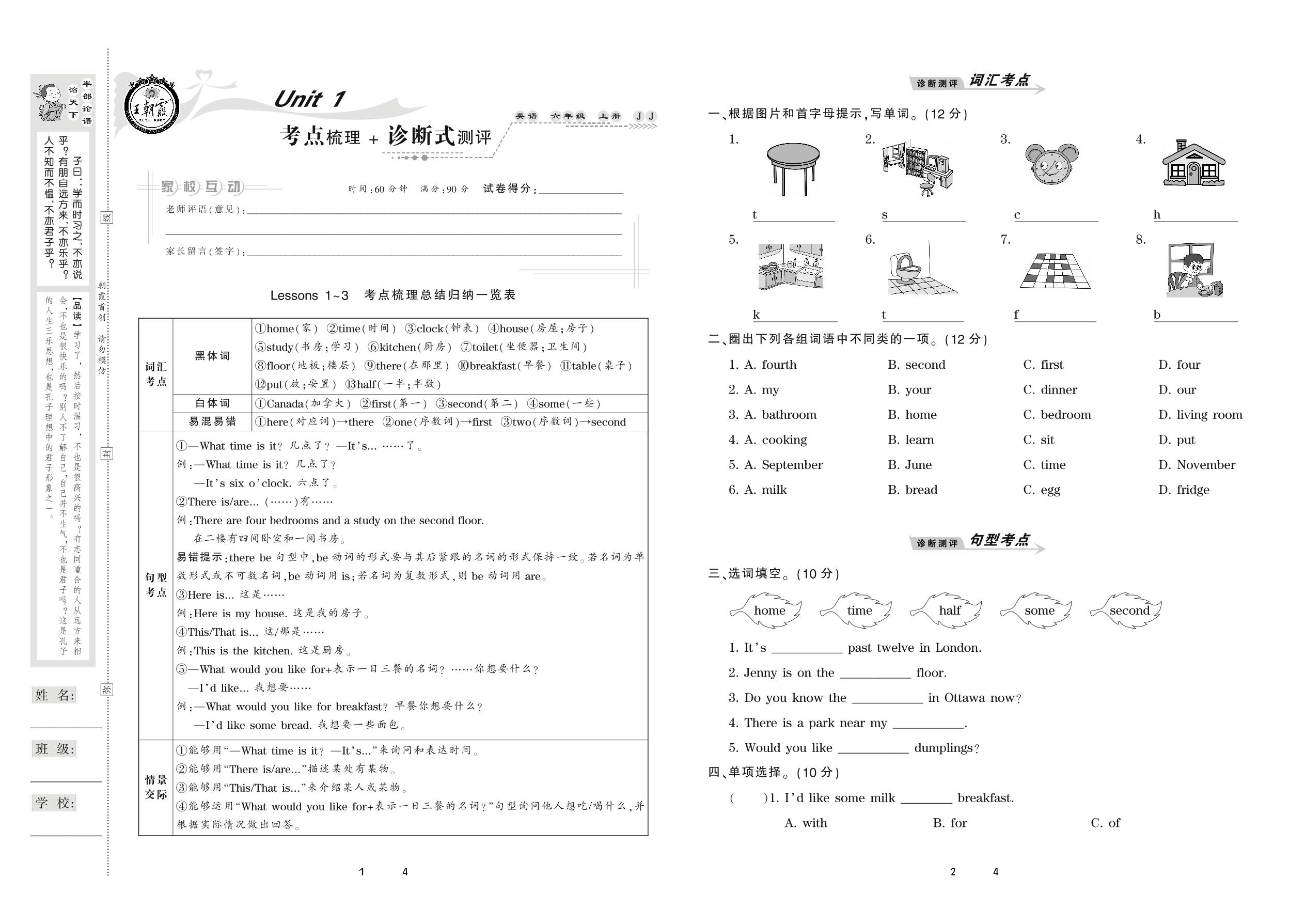 2020上册六年级英语冀教版 Unit 1 考点梳理+诊断式测评 Lessons 1-3