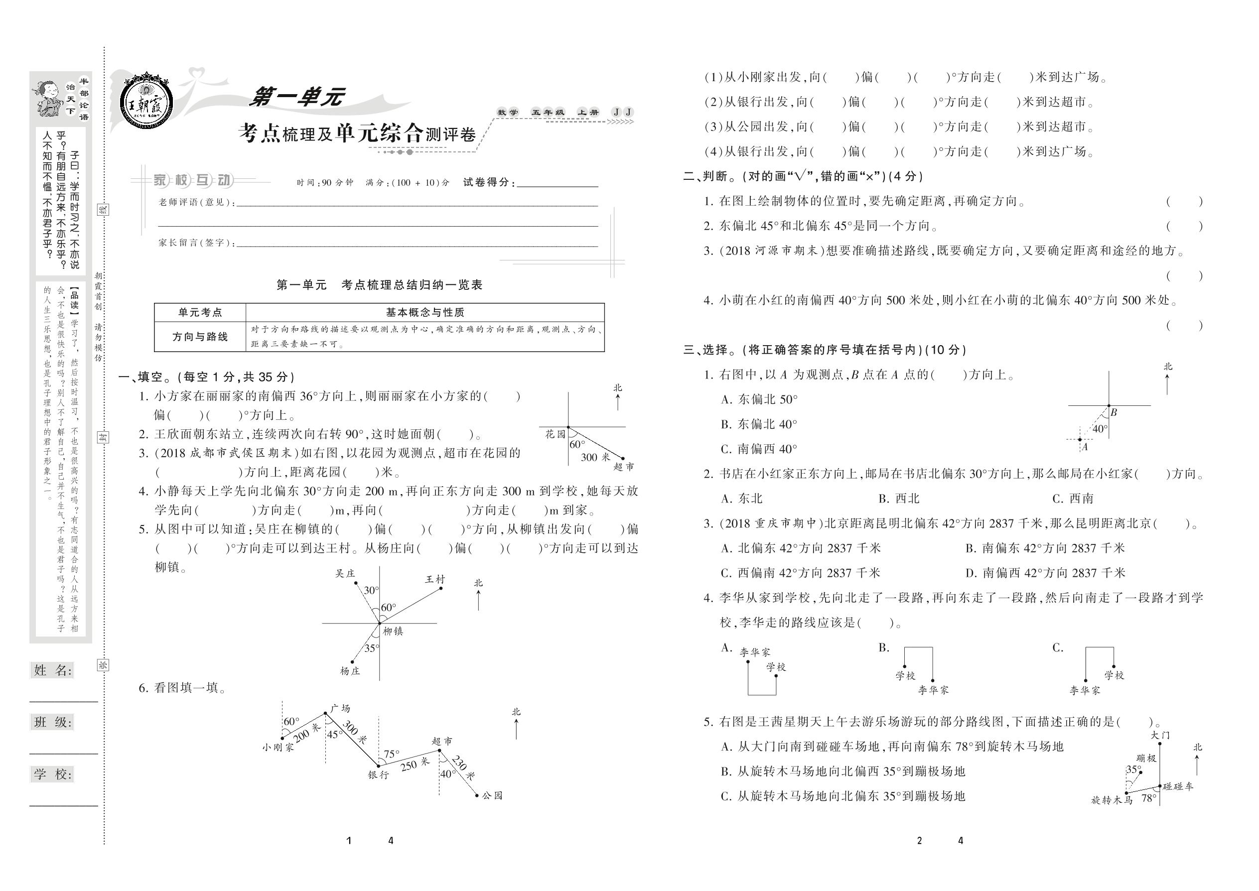 2020上册五年级数学冀教版 第一单元 考点梳理及单元综合测评卷