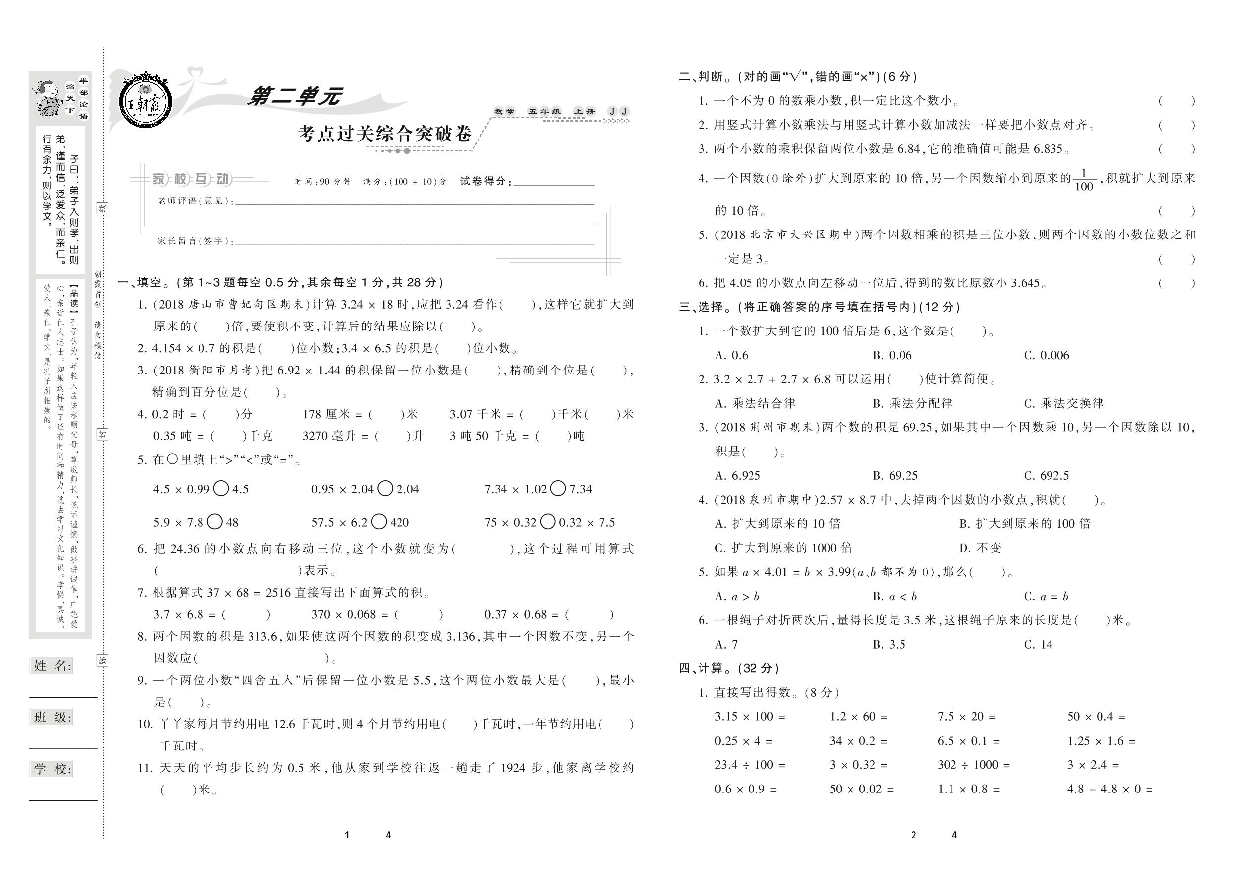 2020上册五年级数学冀教版 第二单元 考点过关综合突破卷