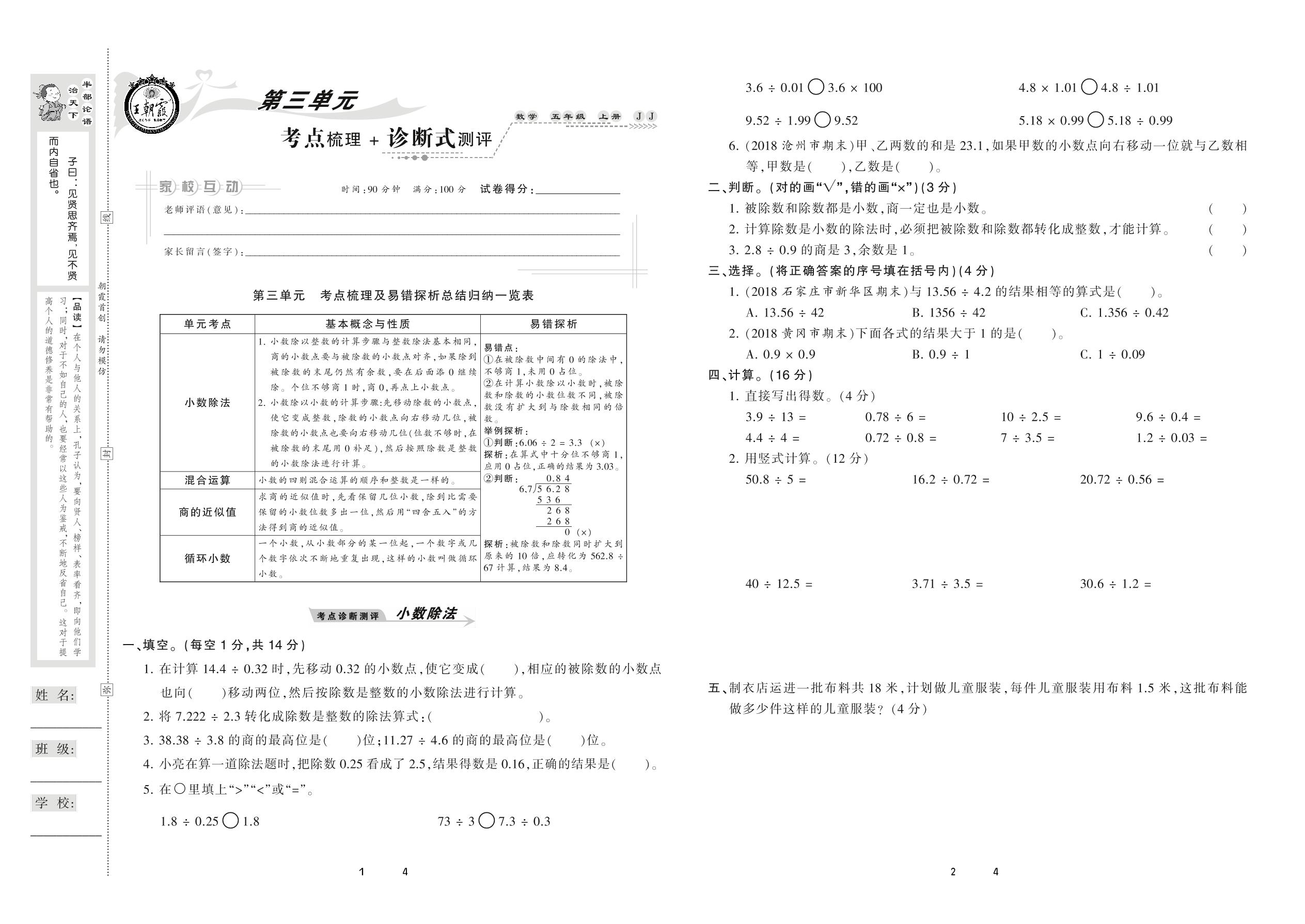 2020上册五年级数学冀教版 第三单元 考点梳理+诊断式测评