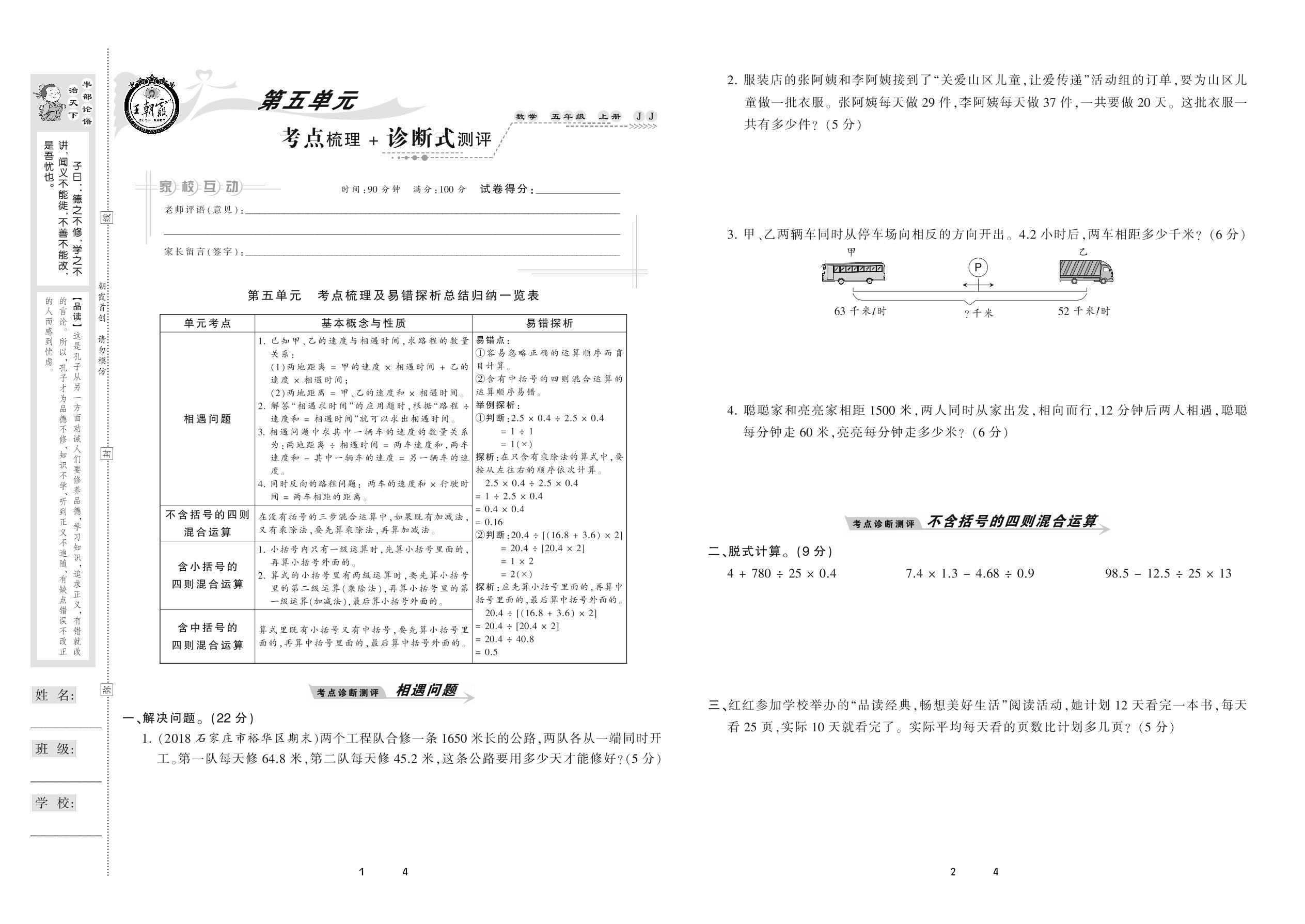 2020上册五年级数学冀教版 第五单元 考点梳理+诊断式测评
