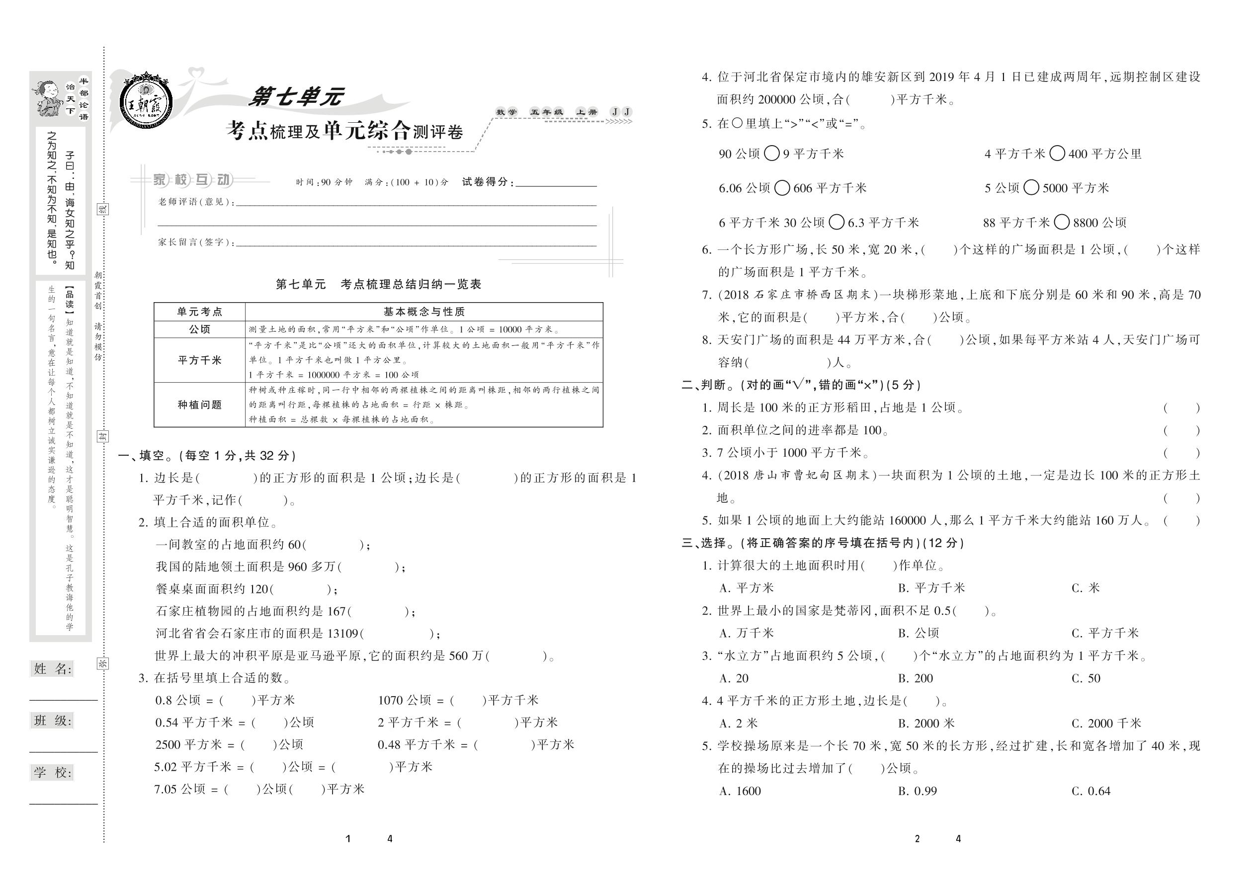 2020上册五年级数学冀教版 第七单元 考点梳理及单元综合测评卷
