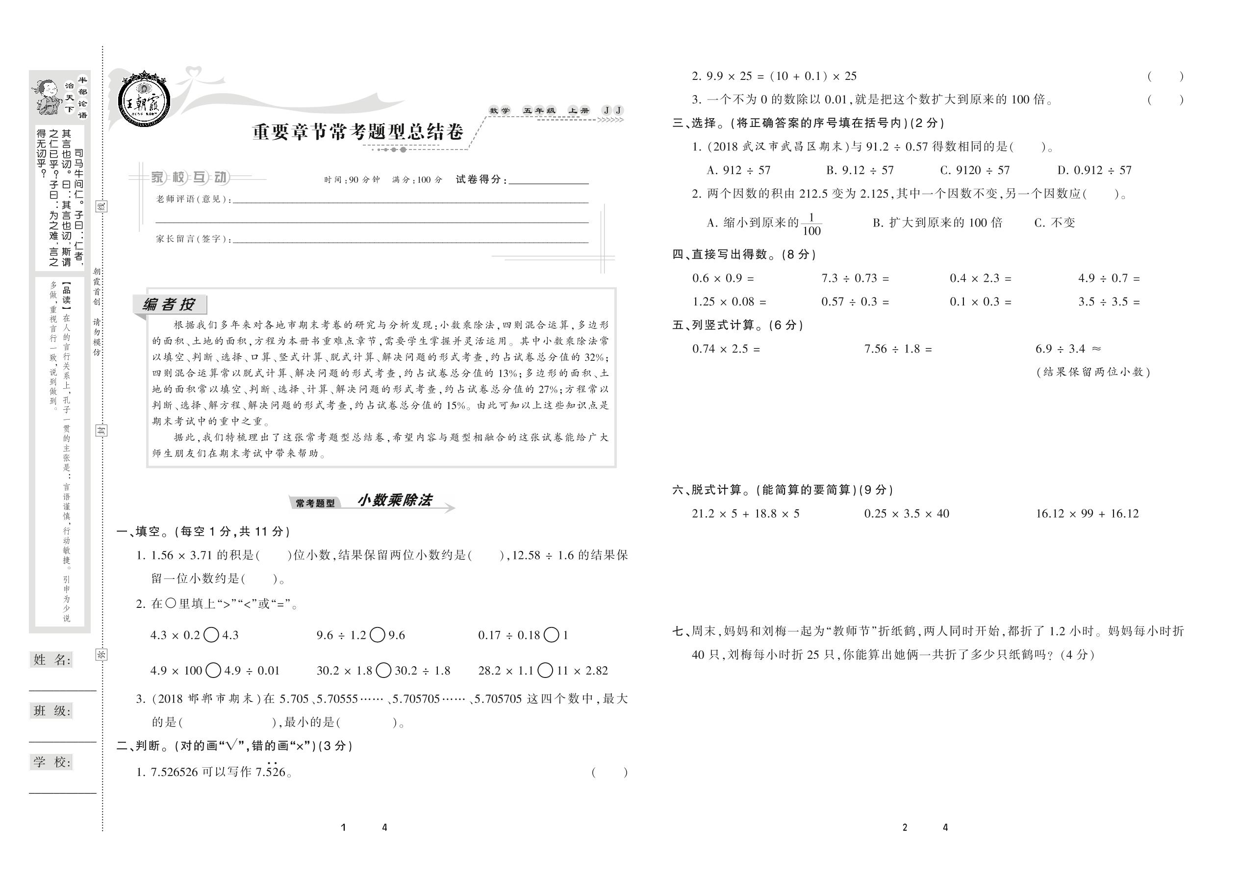 2020上册五年级数学冀教版 重要章节常考题型总结卷