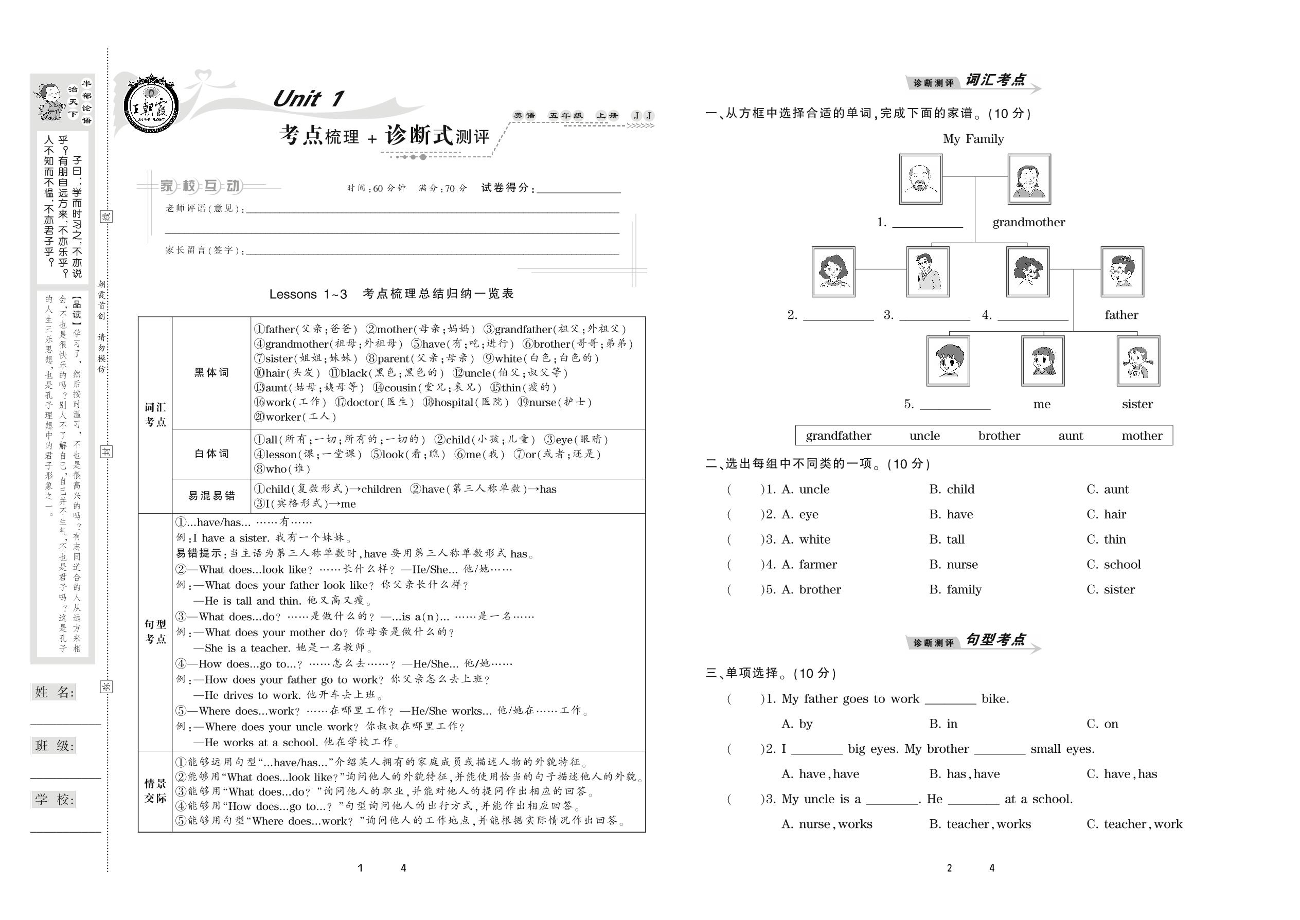 2020上册五年级英语冀教版 Unit 1 考点梳理+诊断式测评 Lessons 1-3