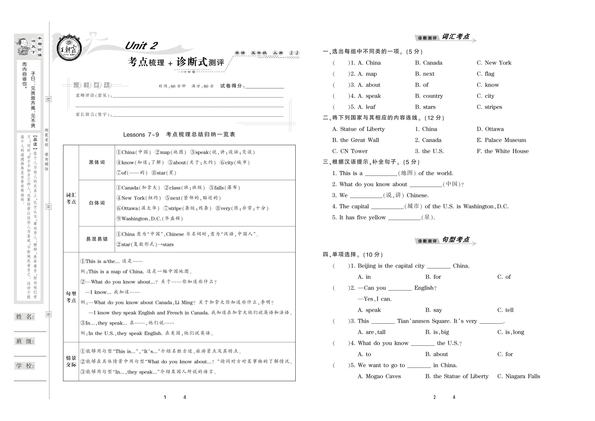 2020上册五年级英语冀教版 Unit 2 考点梳理+诊断式测评 Lessons 7-9