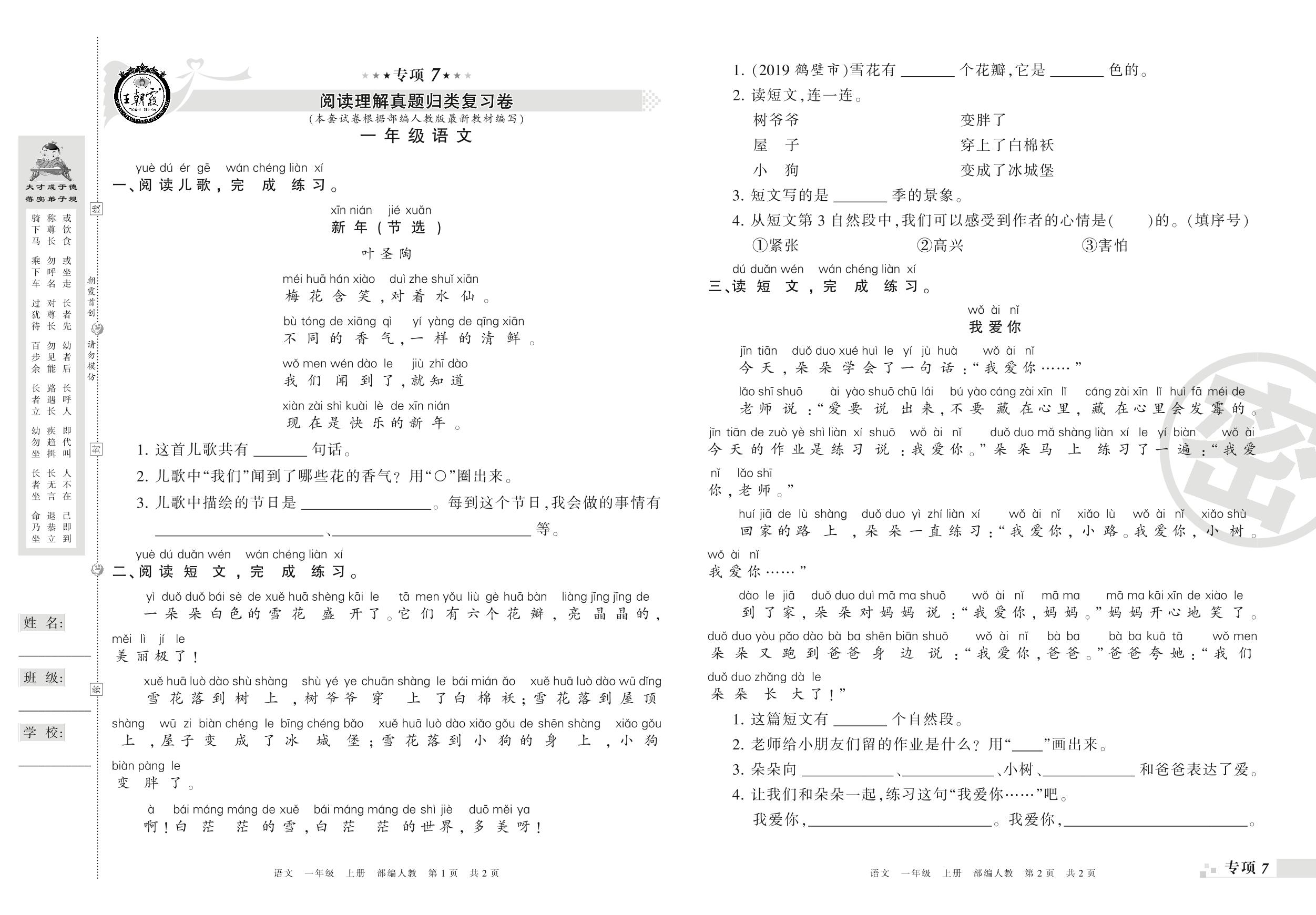 王朝霞期末专项卷——阅读理解、写话真题归类复习卷一年级上册语文(人教版)_R210731180816【0】