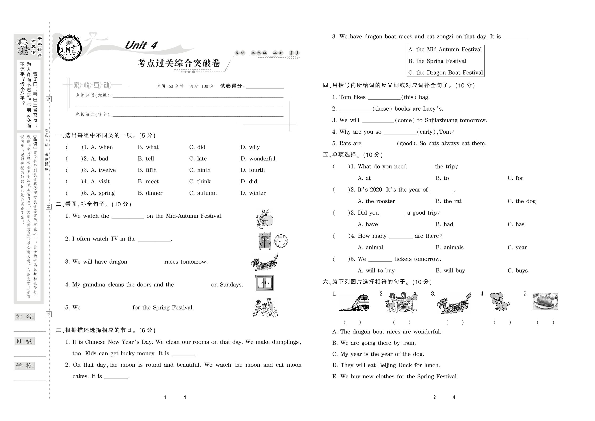 2020上册五年级英语冀教版 Unit 4 考点过关综合突破卷