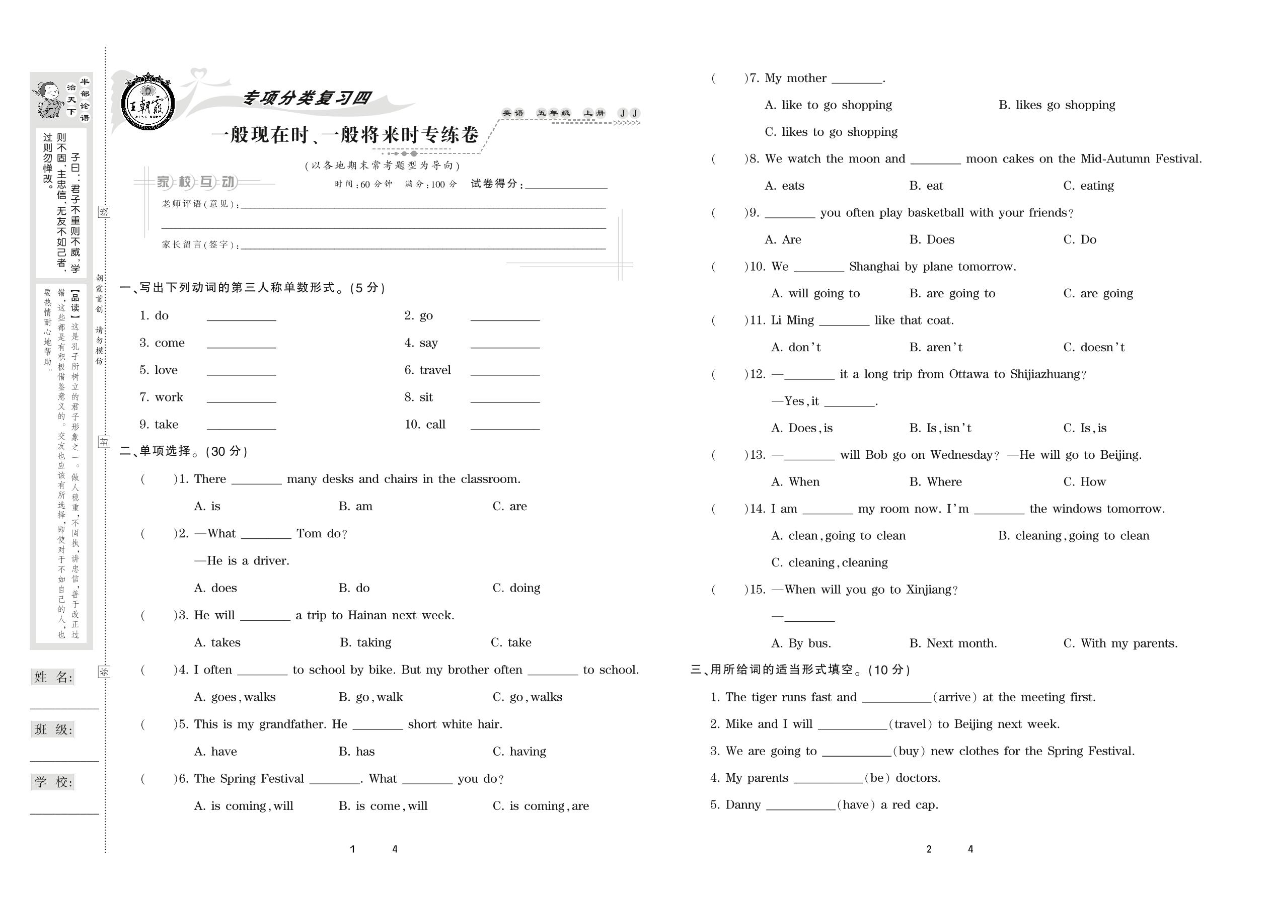 2020上册五年级英语冀教版 一般现在时、一般将来时专练卷