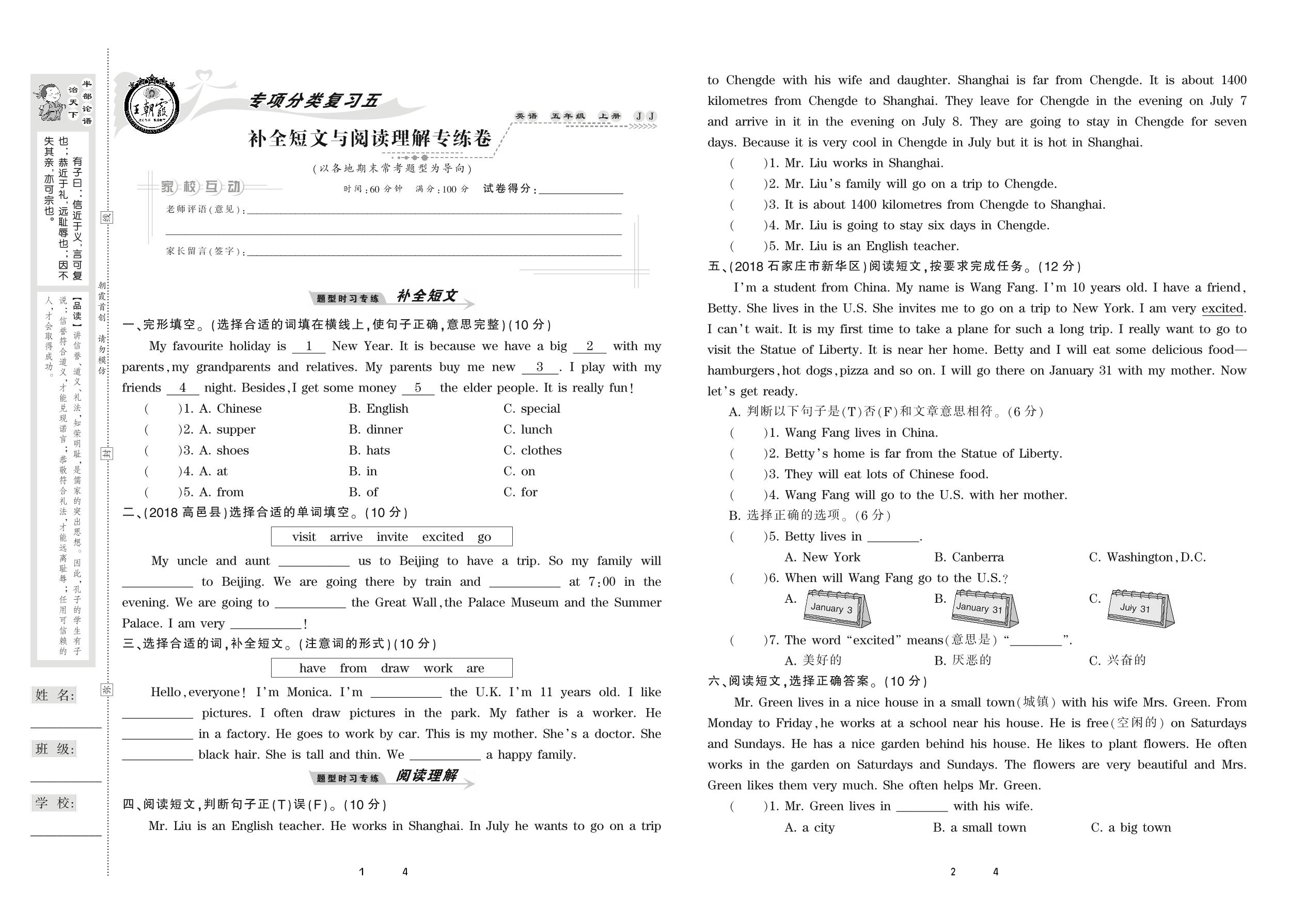 2020上册五年级英语冀教版 补全短文与阅读理解专练卷