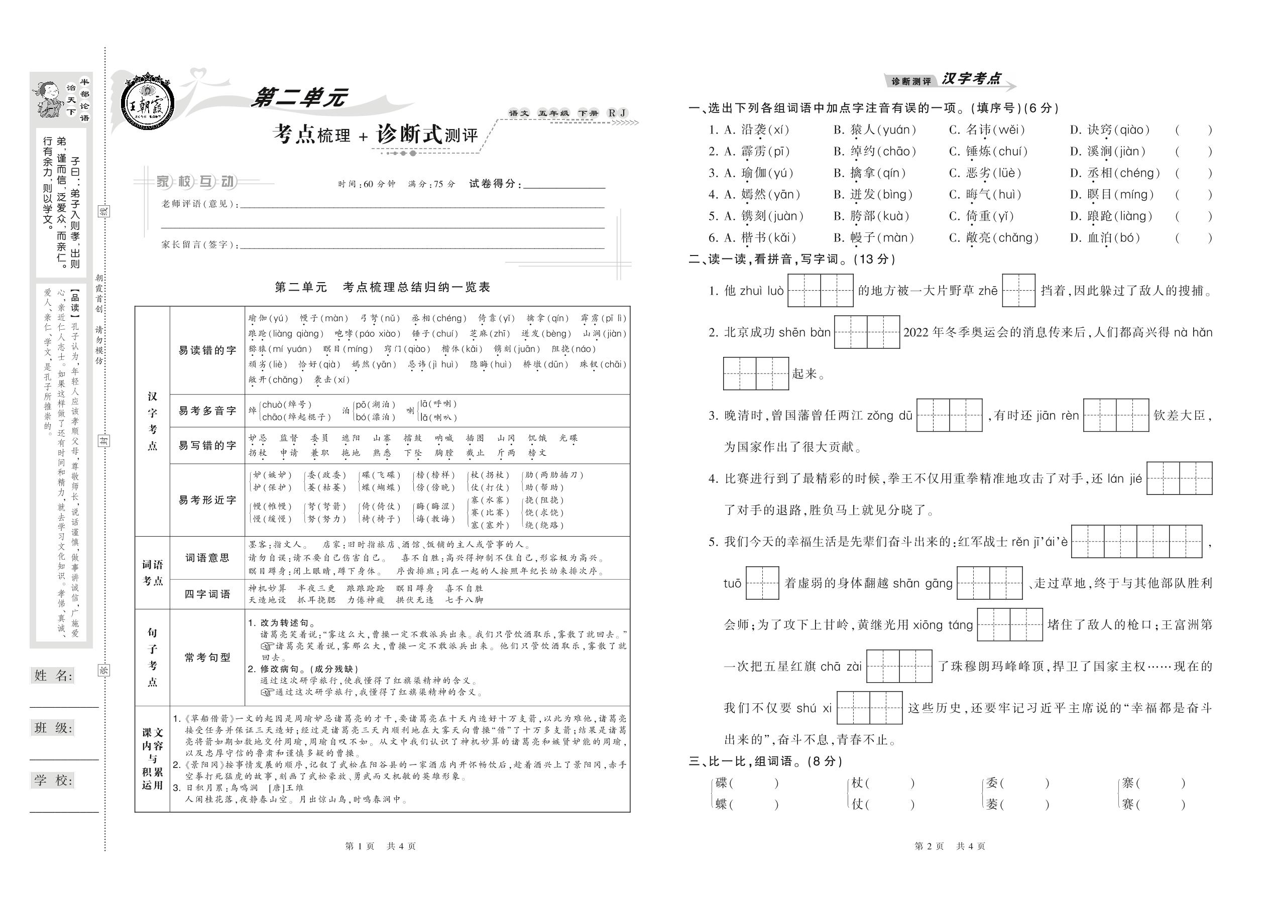 2021下册五年级语文人教版 第二单元 考点梳理+诊断式测评