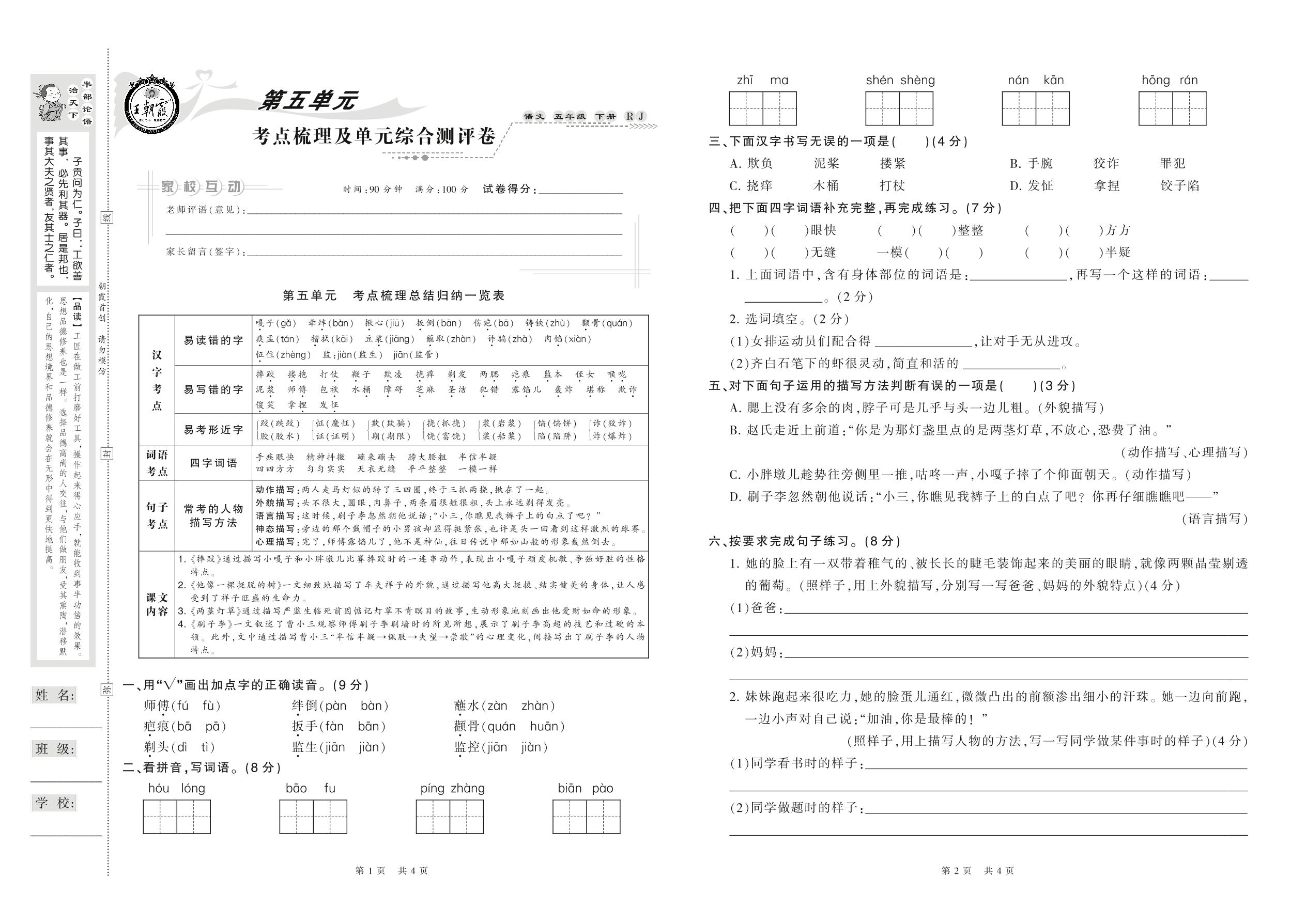 2021下册五年级语文人教版 第五单元 考点梳理及单元综合测评卷
