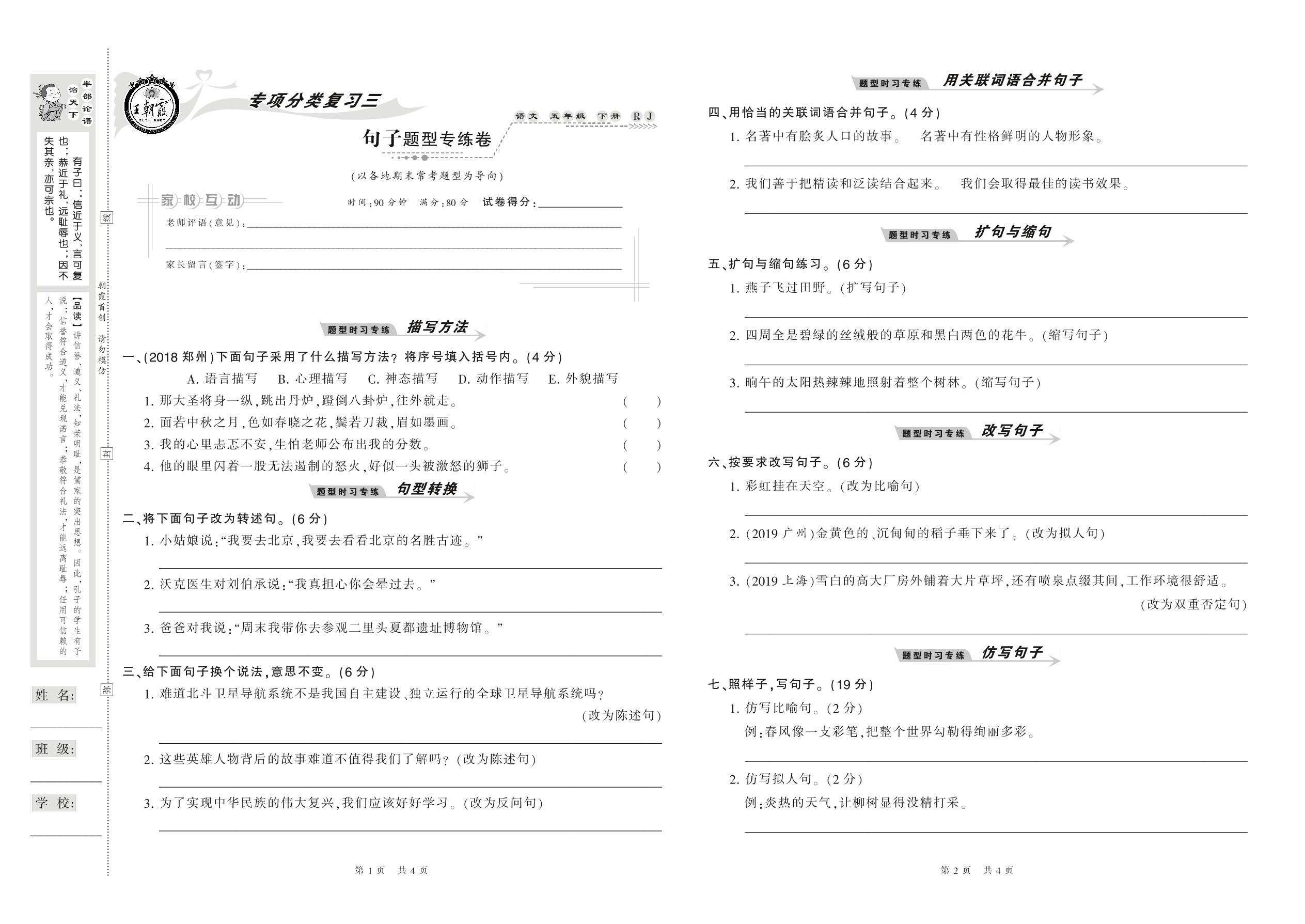2021下册五年级语文人教版 句子题型专练卷