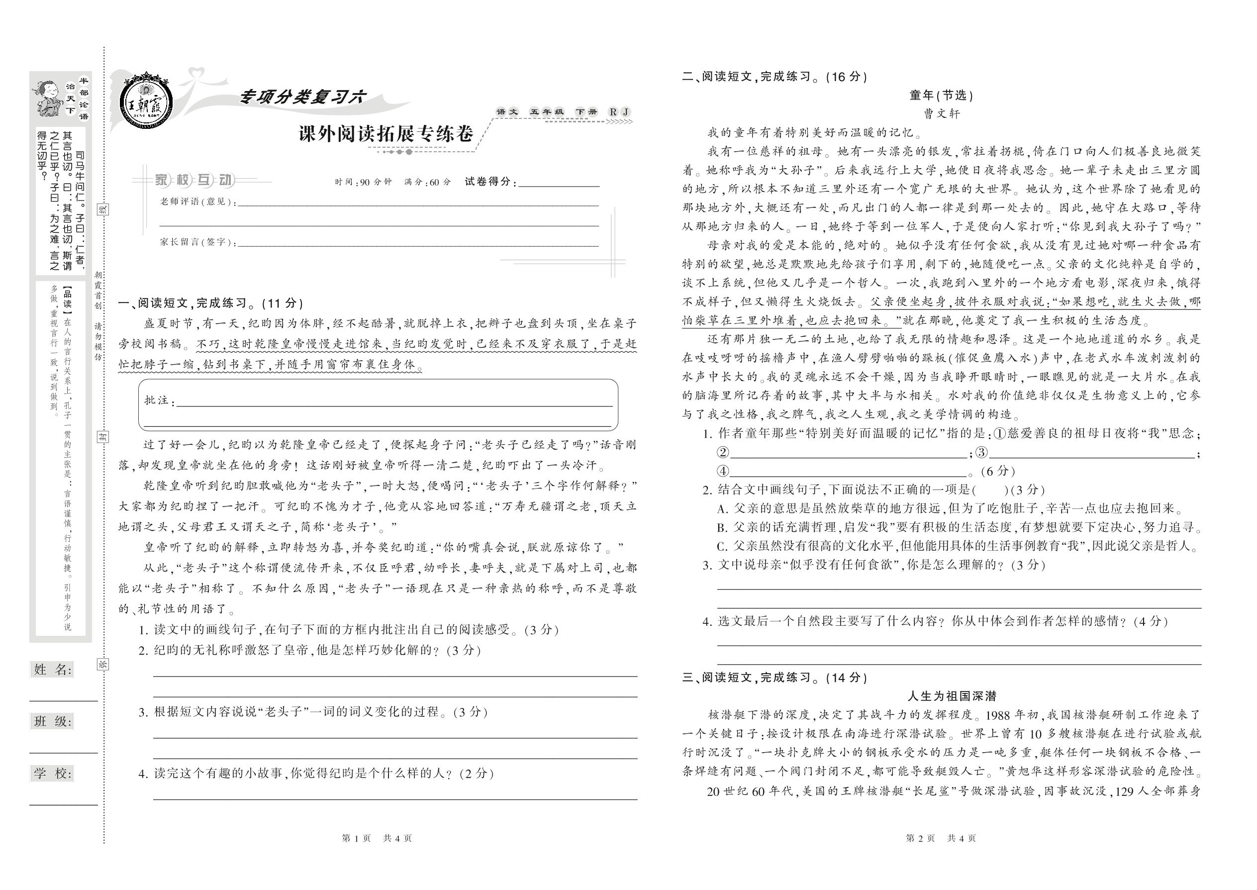 2021下册五年级语文人教版 课外阅读拓展专练卷