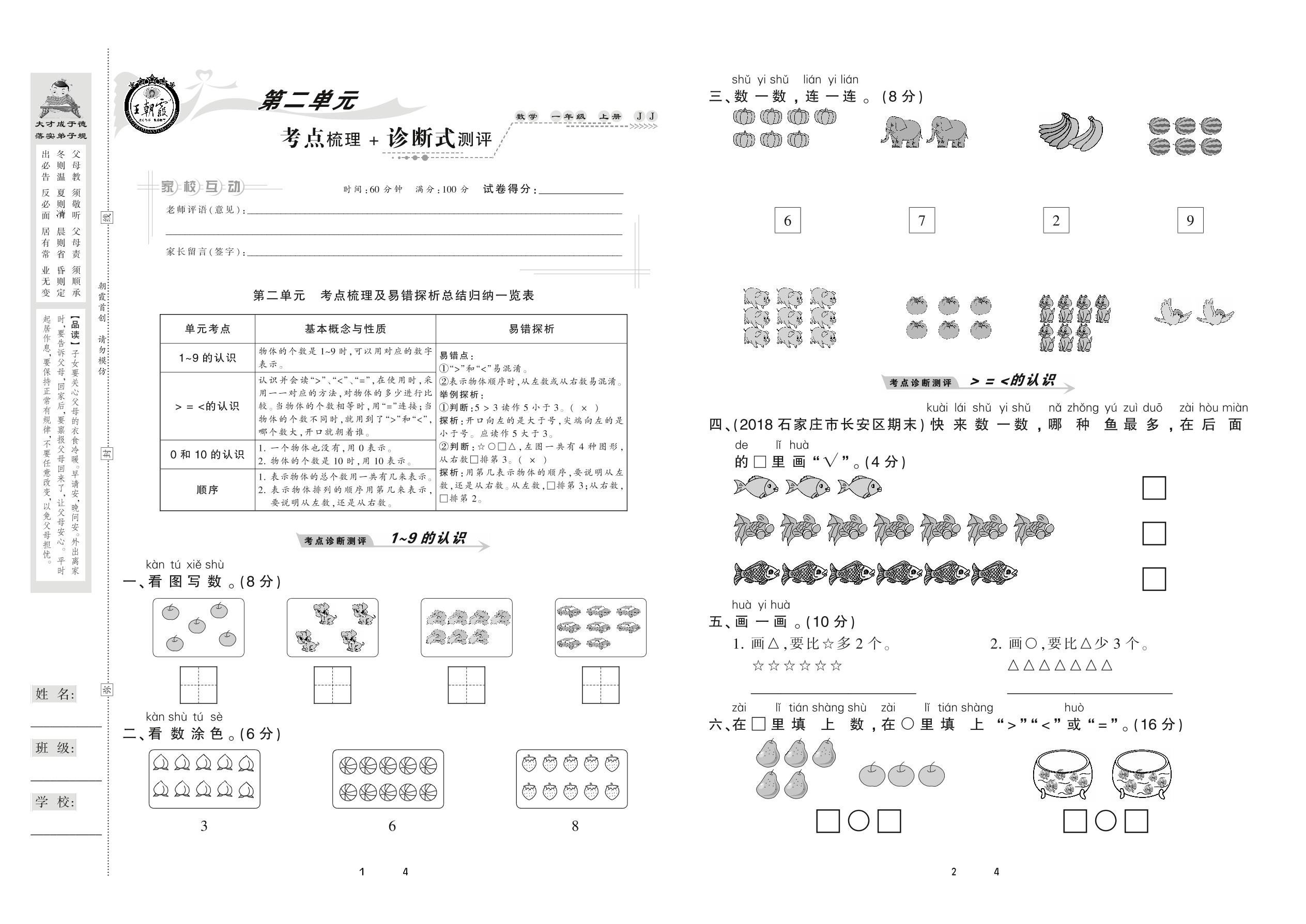 2020上册一年级数学冀教版 第二单元 考点梳理+诊断式测评