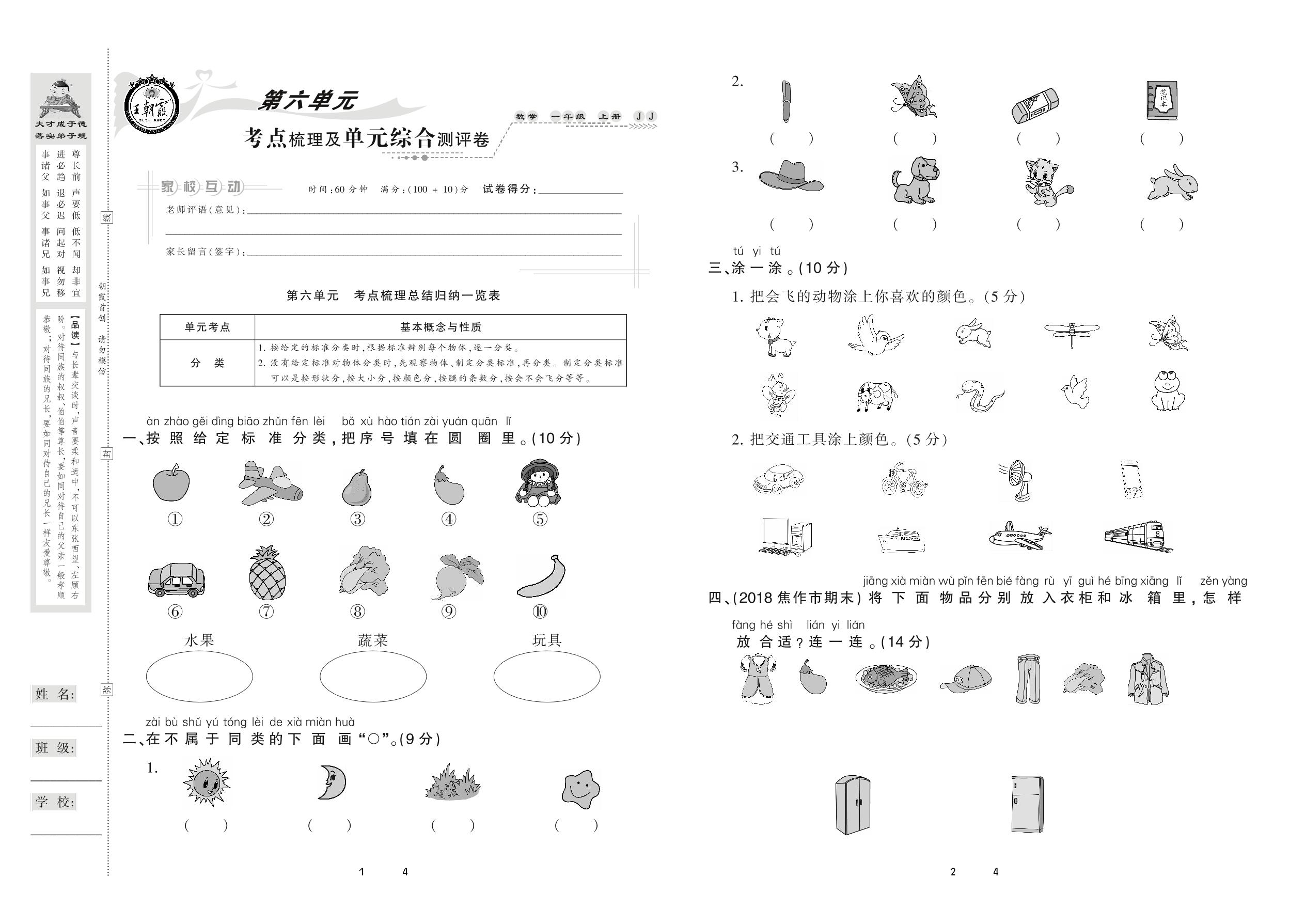 2020上册一年级数学冀教版 第六单元 考点梳理及单元综合测评卷