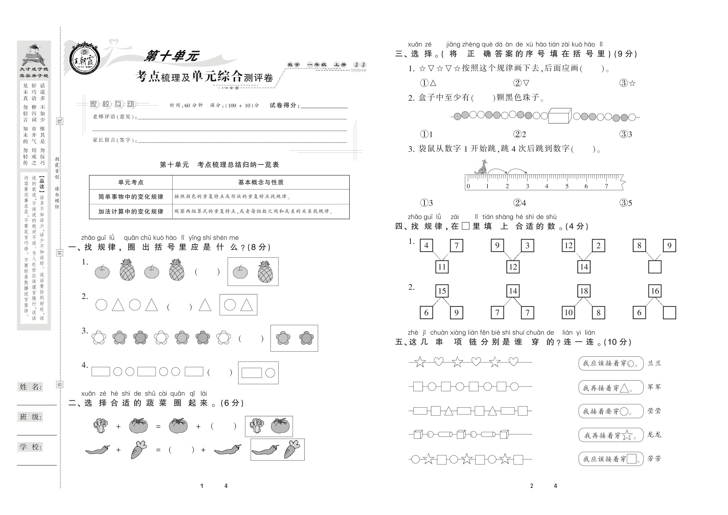 2020上册一年级数学冀教版 第十单元 考点梳理及单元综合测评卷