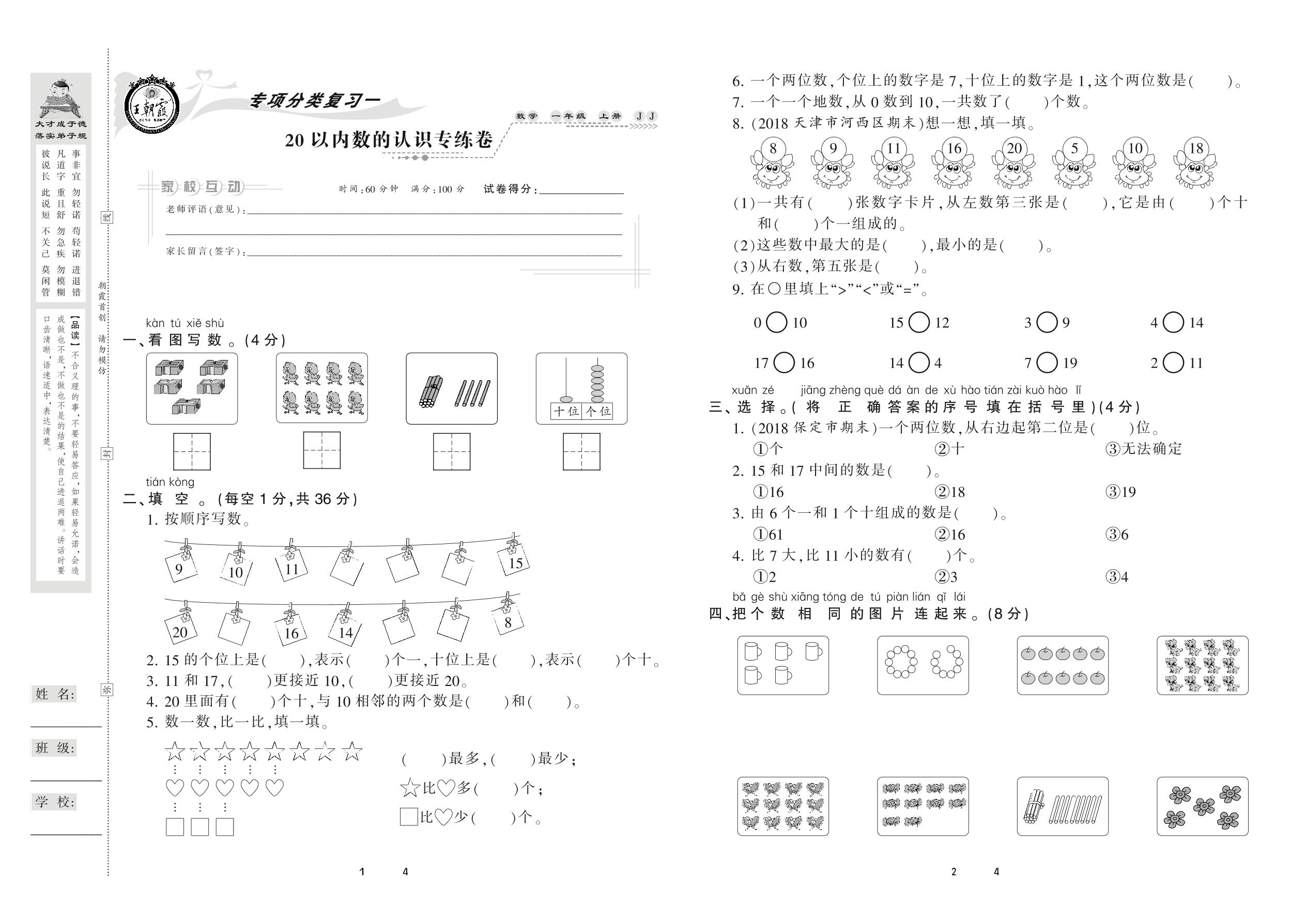 2020上册一年级数学冀教版 20以内数的认识专练卷