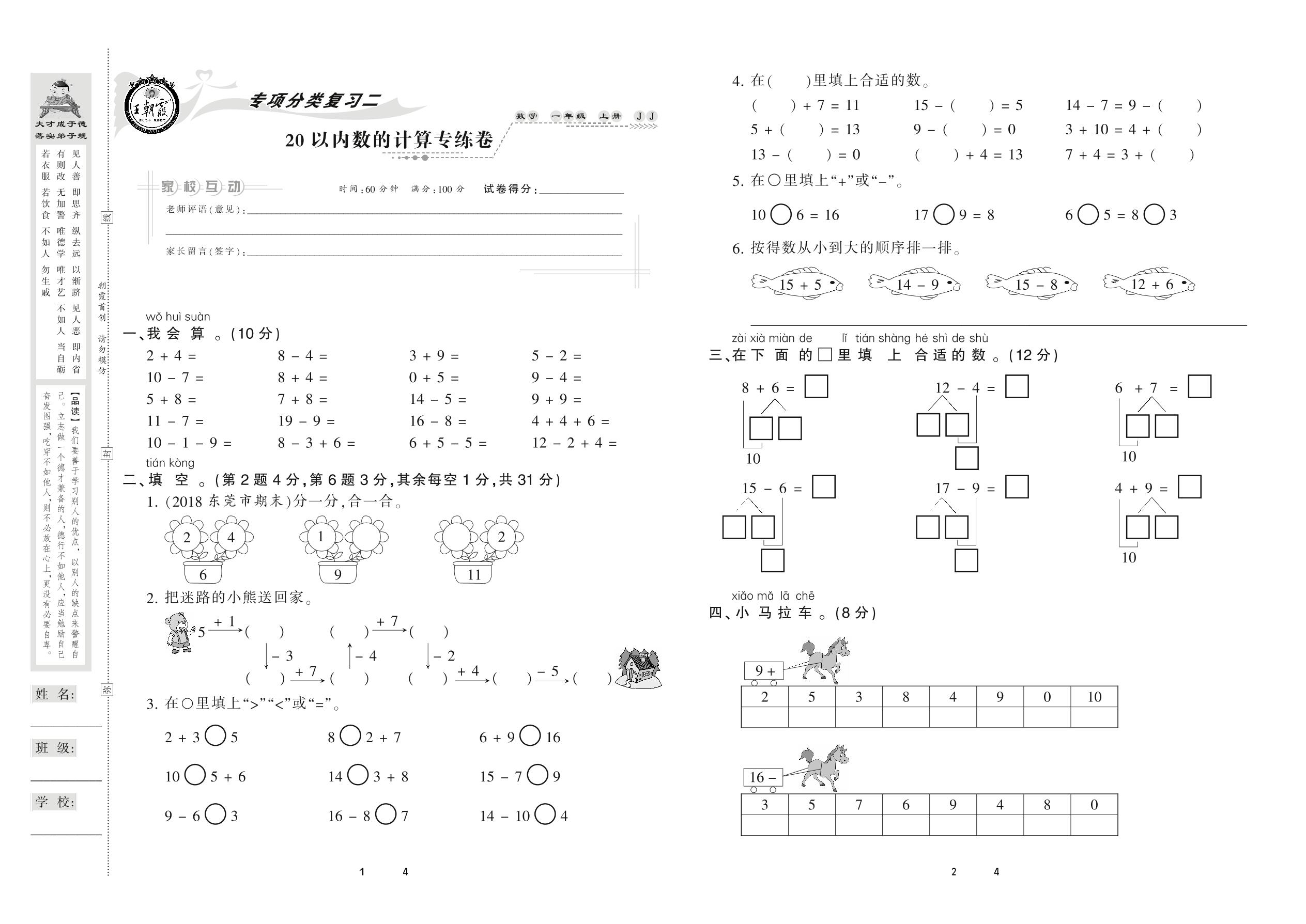 2020上册一年级数学冀教版 20以内数的计算专练卷
