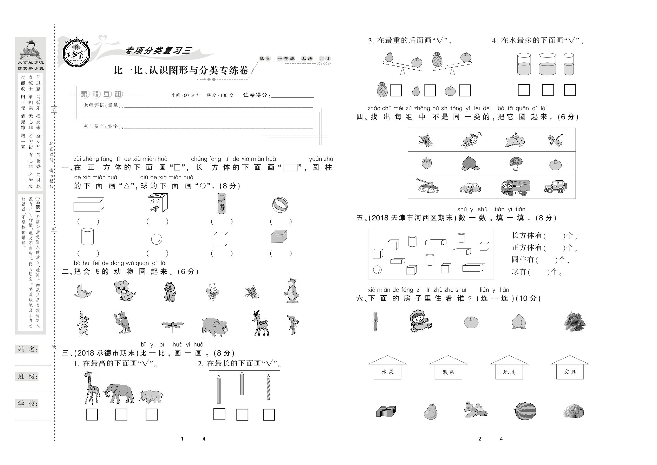 2020上册一年级数学冀教版 比一比、认识图形与分类专练卷